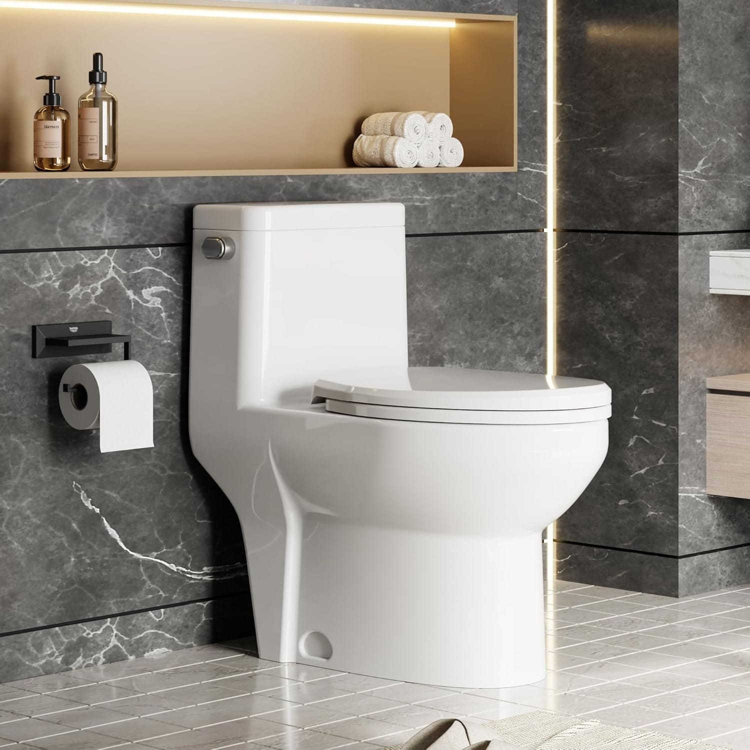 One-Piece Elongated Toilet, V-Cover, Soft Close Seat, Left-Hand Lever, Comfortable Bathroom Height, White