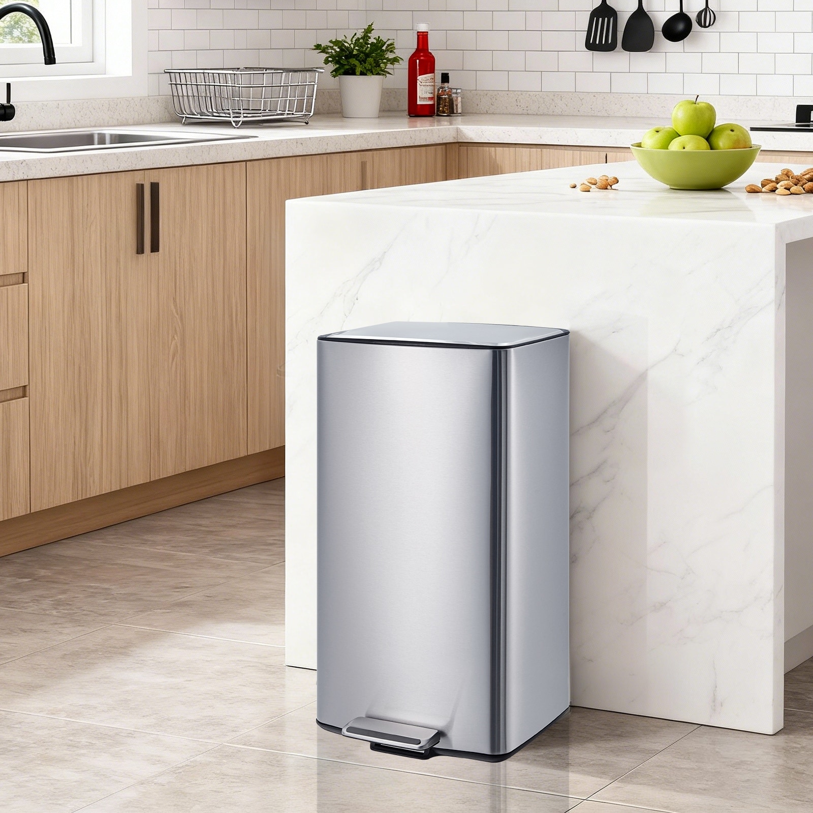 8 Gallon Step Trash Can with Soft-Close Bamboo Lid & Inner Bucket, Stainless Steel Garbage Can