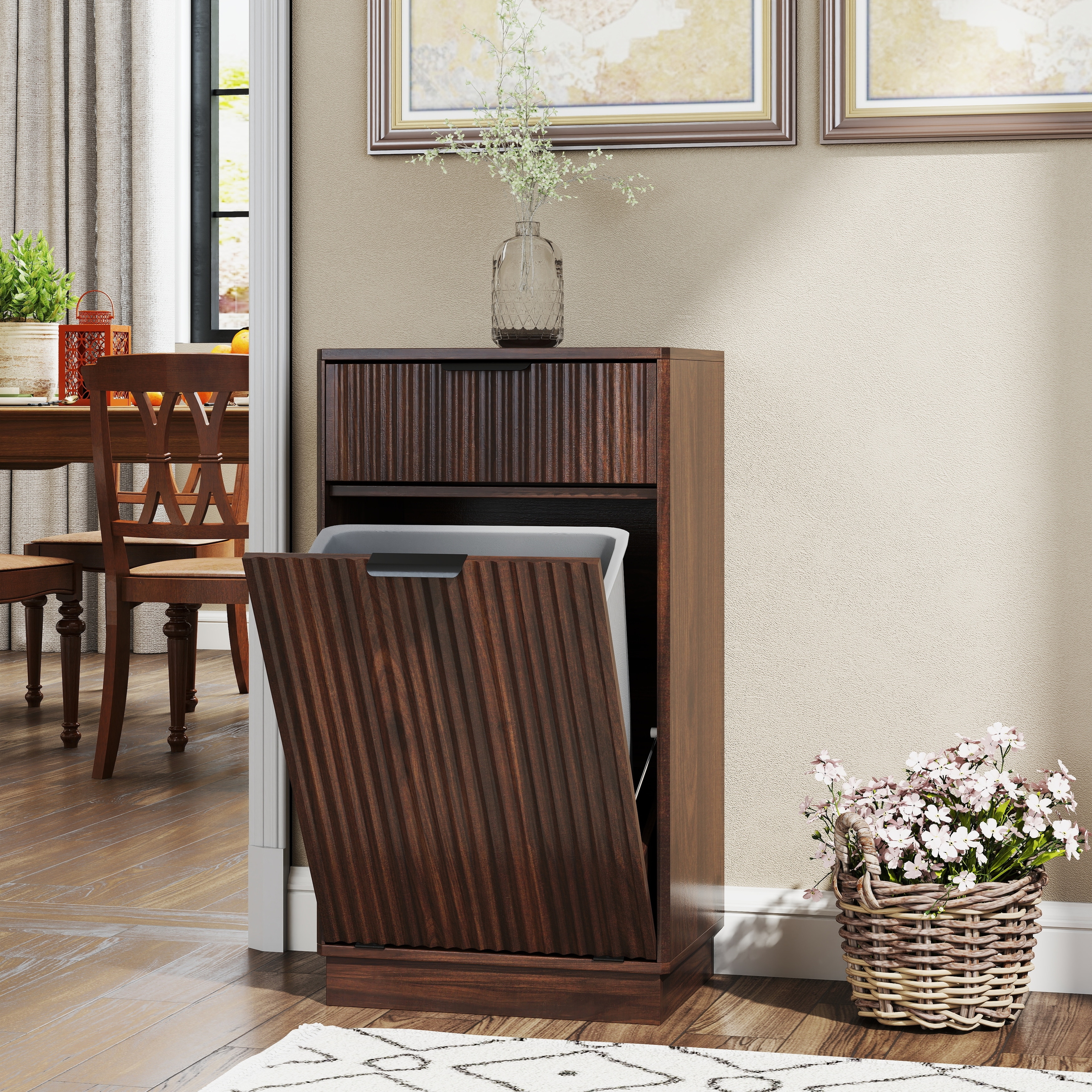 10-Gallon Woodgrain Tilt-Out Trash Can Cabinet, Wooden Recycling Cabinet with Wave-Textured Hideaway Drawer & Pull-Out Bin