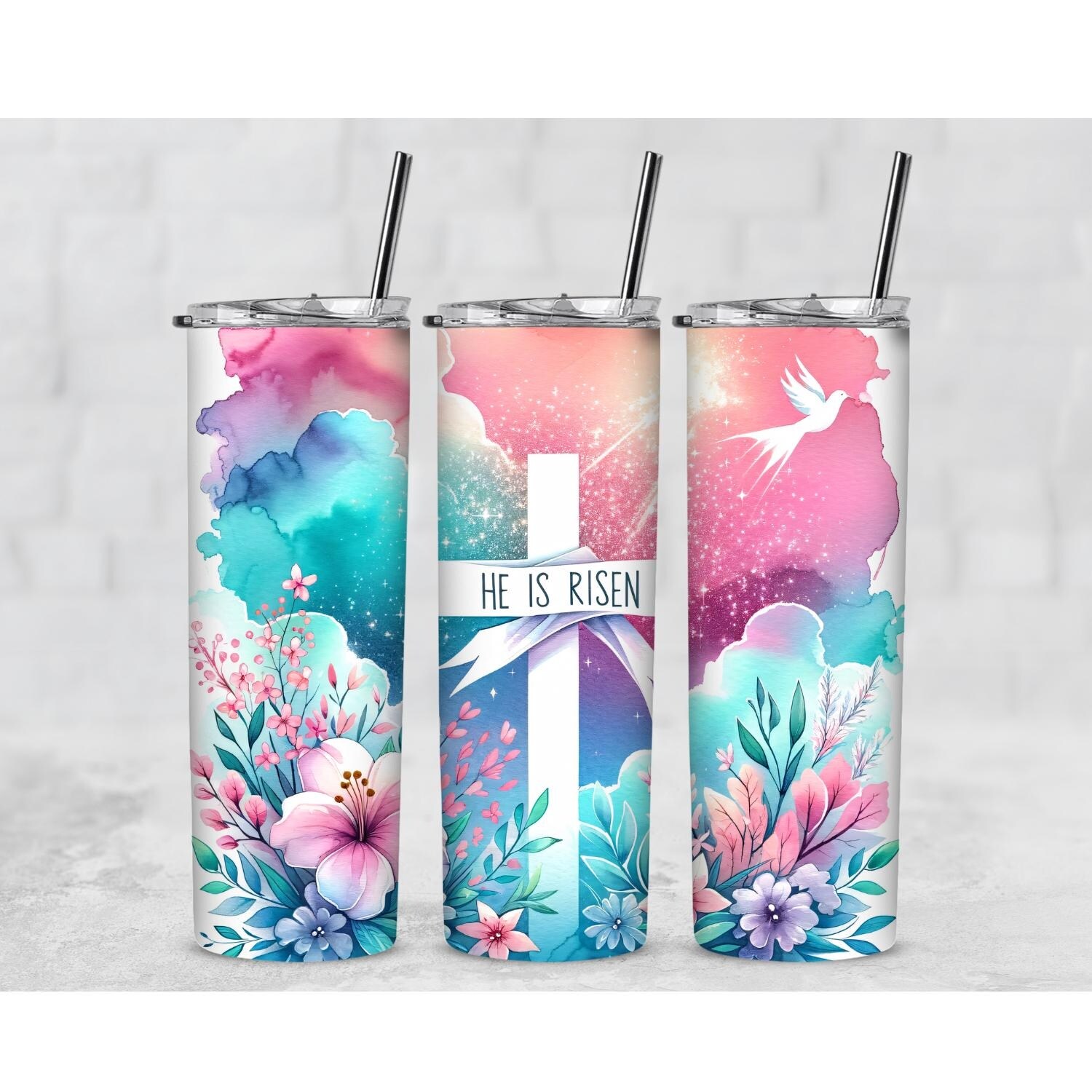 Blue Cross He is Risen Christian 20 Oz Skinny Metal Tumbler w/Lid and Straw - Multi