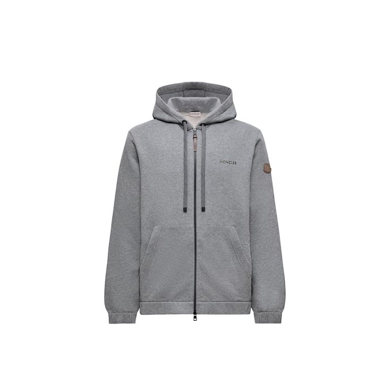 Leather Logo Cotton Blend Zip-Up Hoodie - Gray - Moncler Sweats