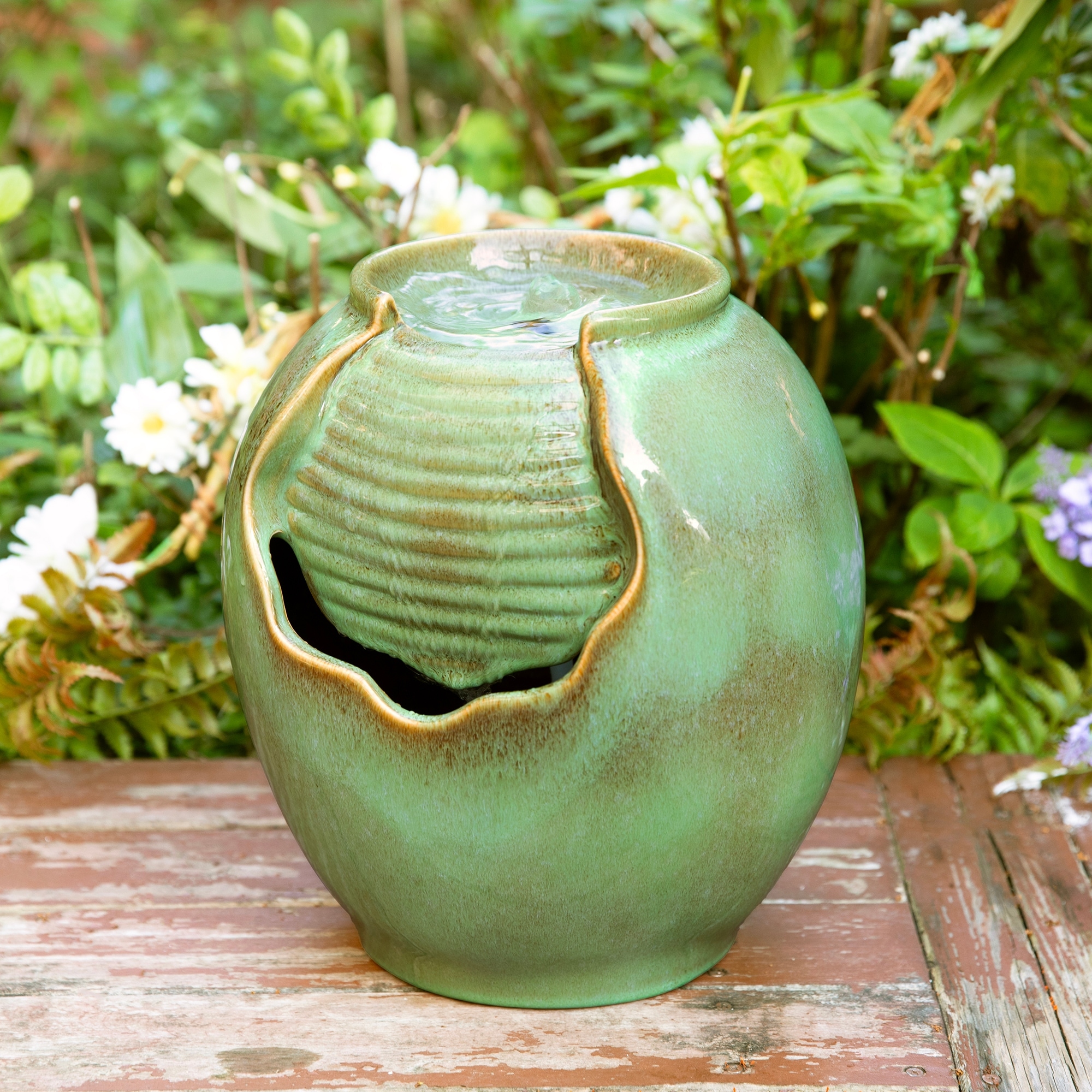 Glitzhome 9"H Leaf Textured Ceramic Jar Indoor Tabletop Water Fountain with LED Lights