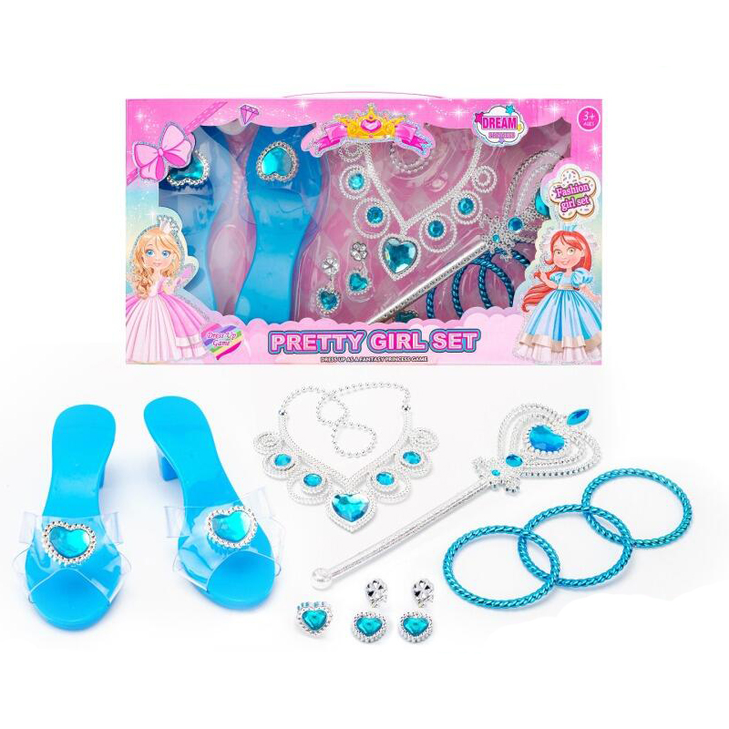 Princess Jewelry Set For Girls, Crystal Shoes, Necklace, Crown, Earrings & Bracelet, Dress Up & Role Play Accessories blue