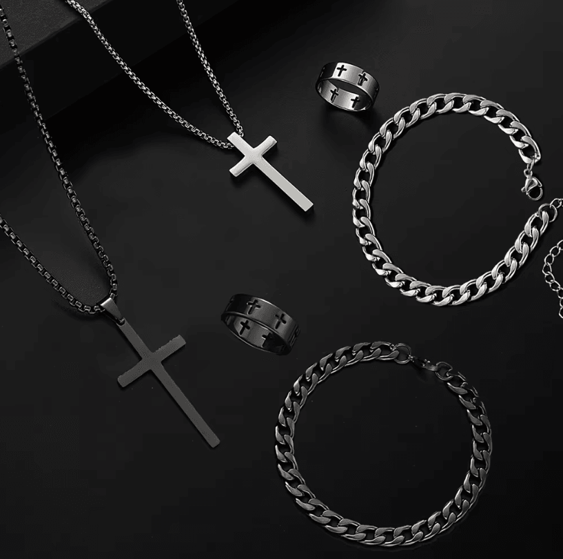 Mens Stainless Steel Cross Jewelry Set Necklace Bracelet Ring Hip Hop Accessories black