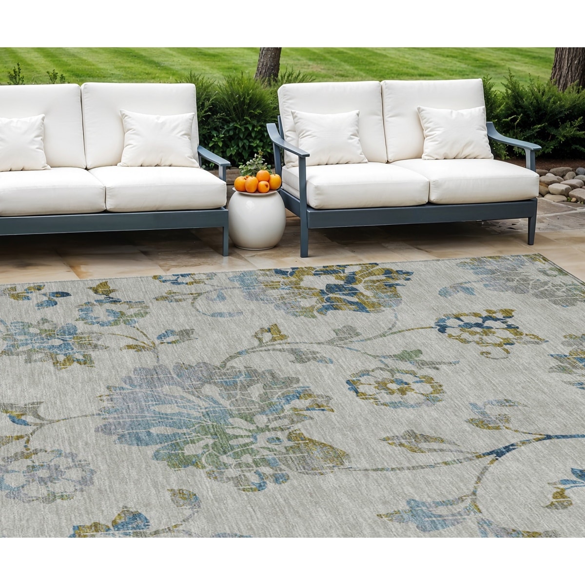 9' X 12' Taupe Navy Blue And Denim Blue Floral Washable Indoor Outdoor Area Rug - 9'3" x 12'3"