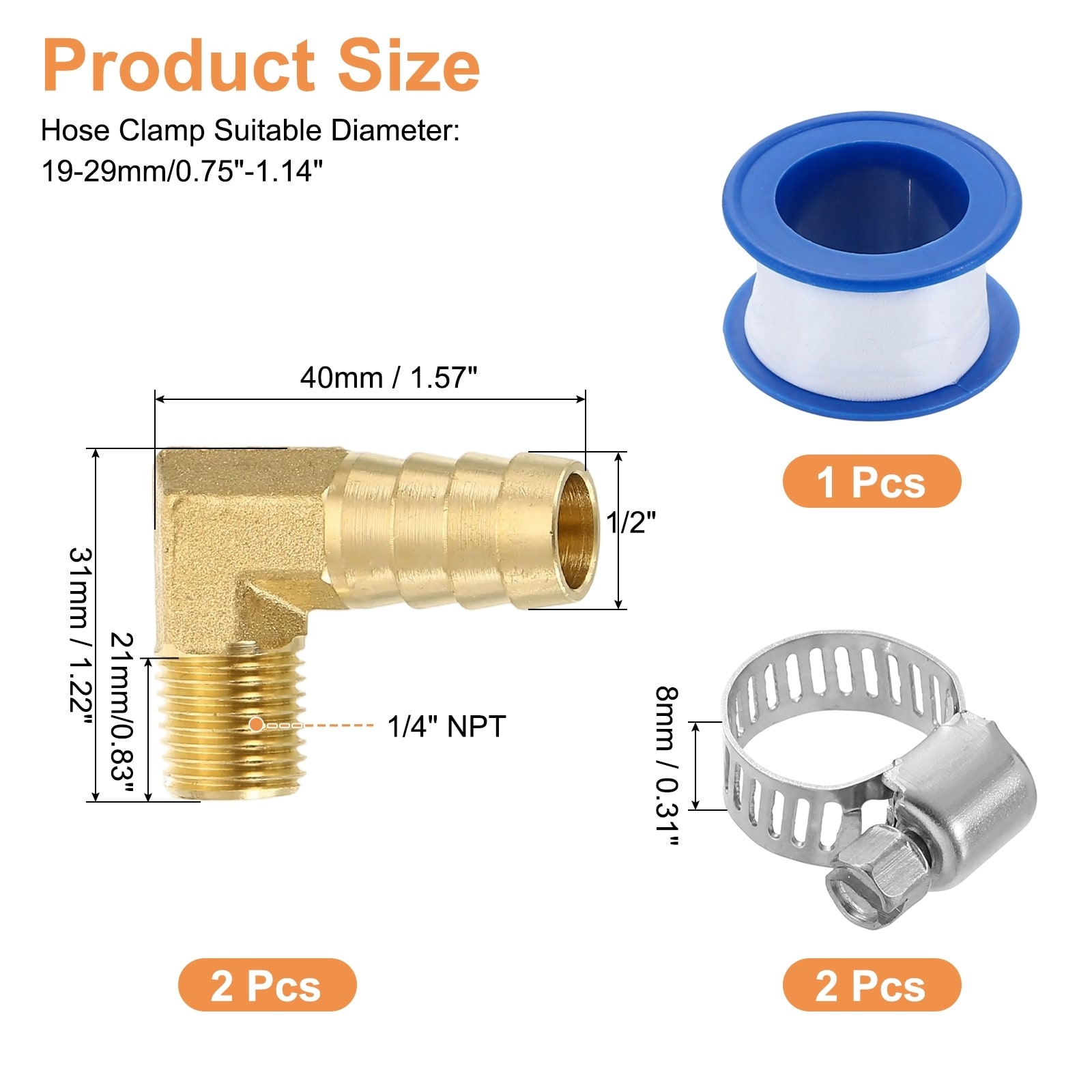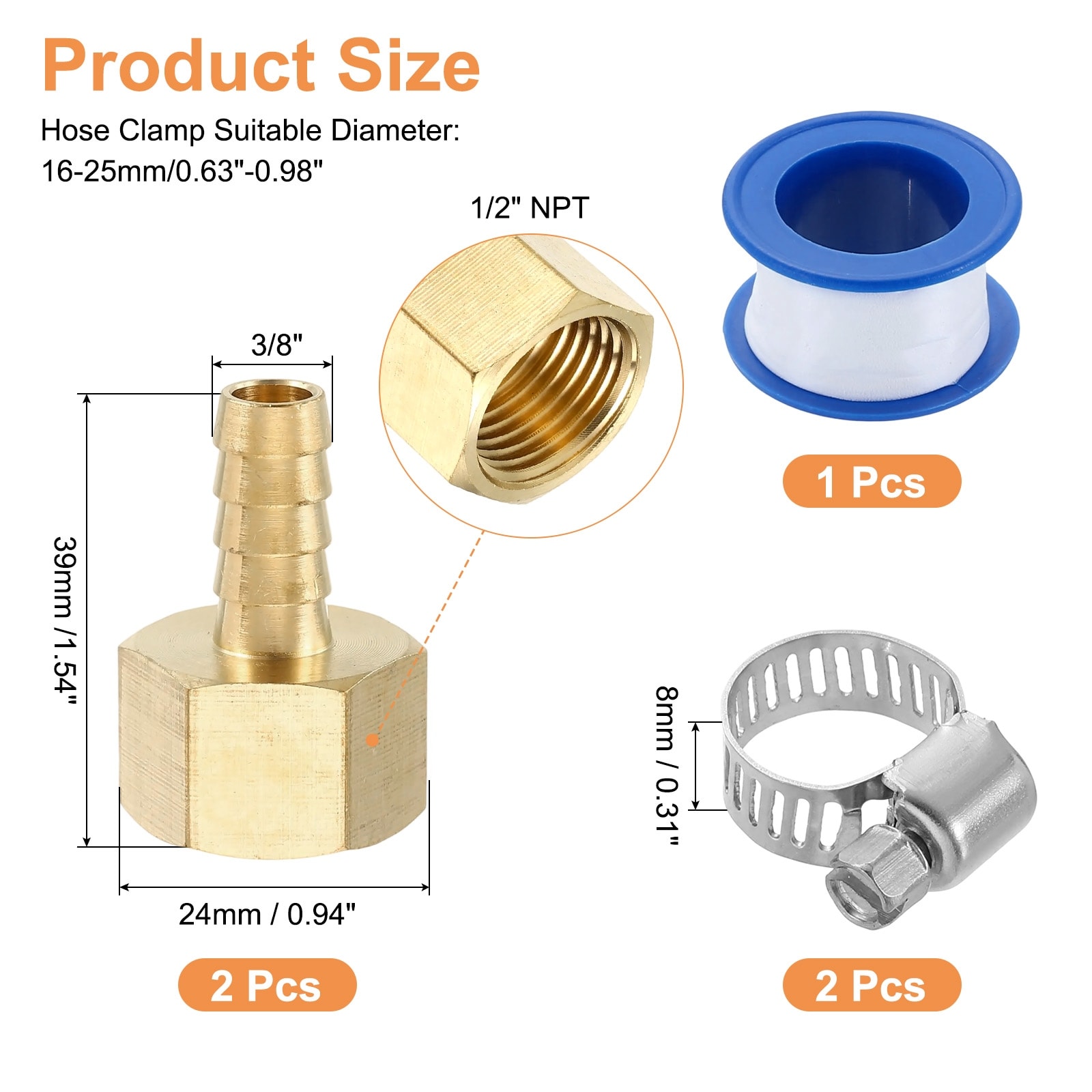 Brass Hose Barb Fittings, Male Couple Hose Connector with Stainless Steel Hose Clamp & PTFE Tape