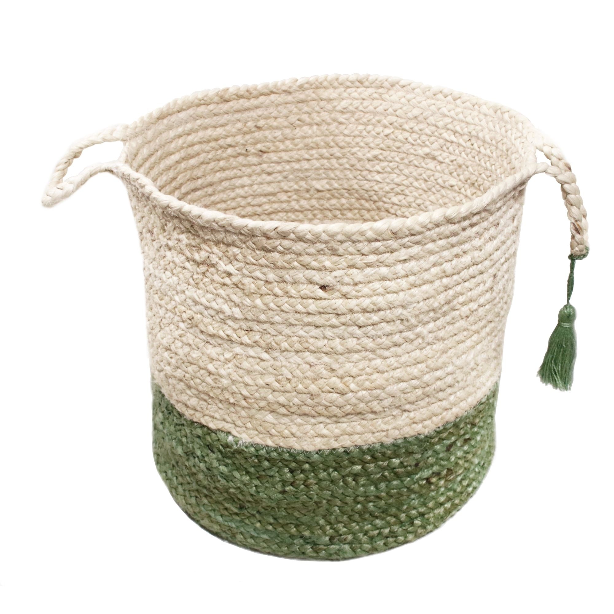 17" Ivory and Green Hand Woven Tasseled Storage Basket with Handles
