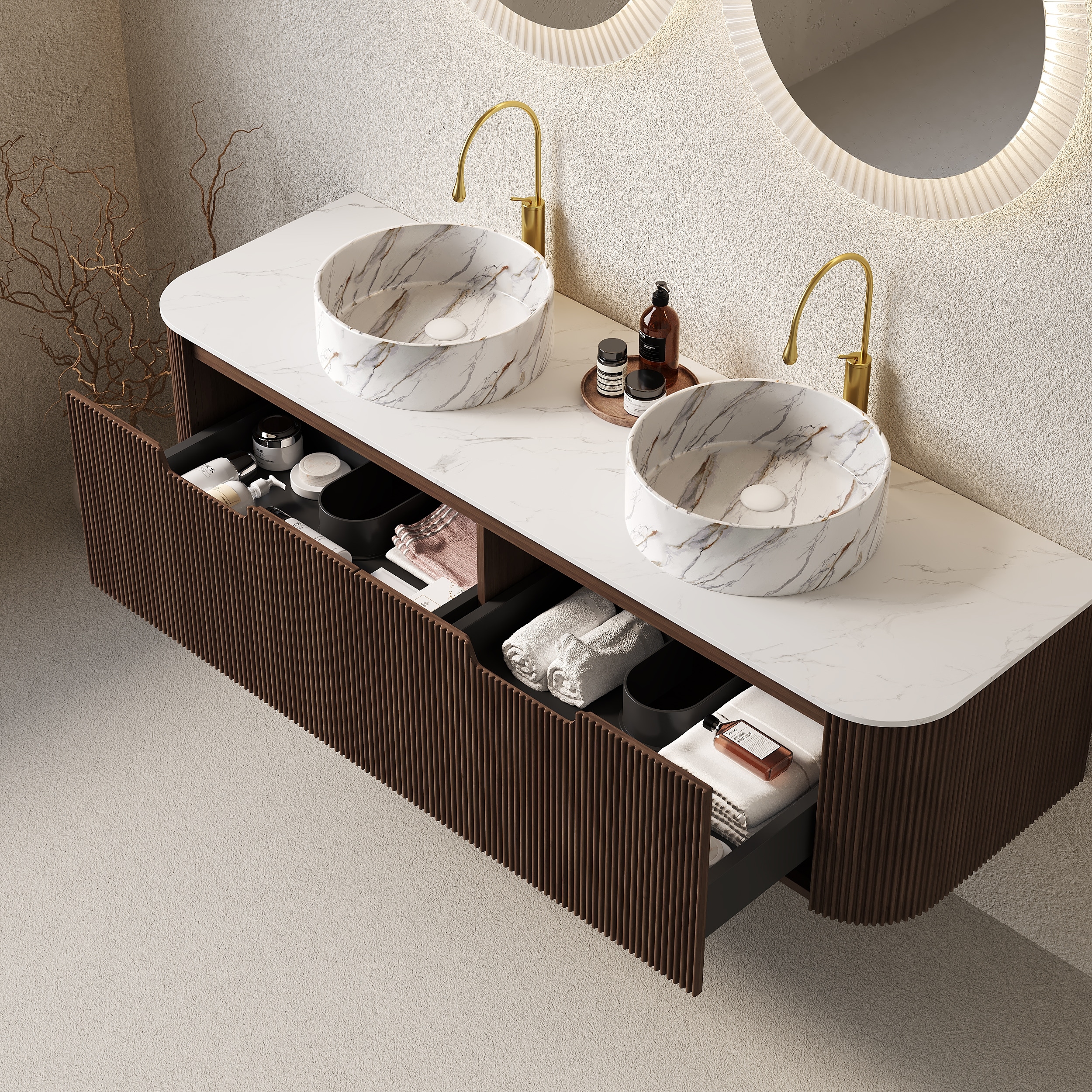 GDFStudio - Dina 60" Curved Edges Striped Bathroom Vanity with 2 White Stone Ceramic Basins, 2 Drawers, NO Faucet
