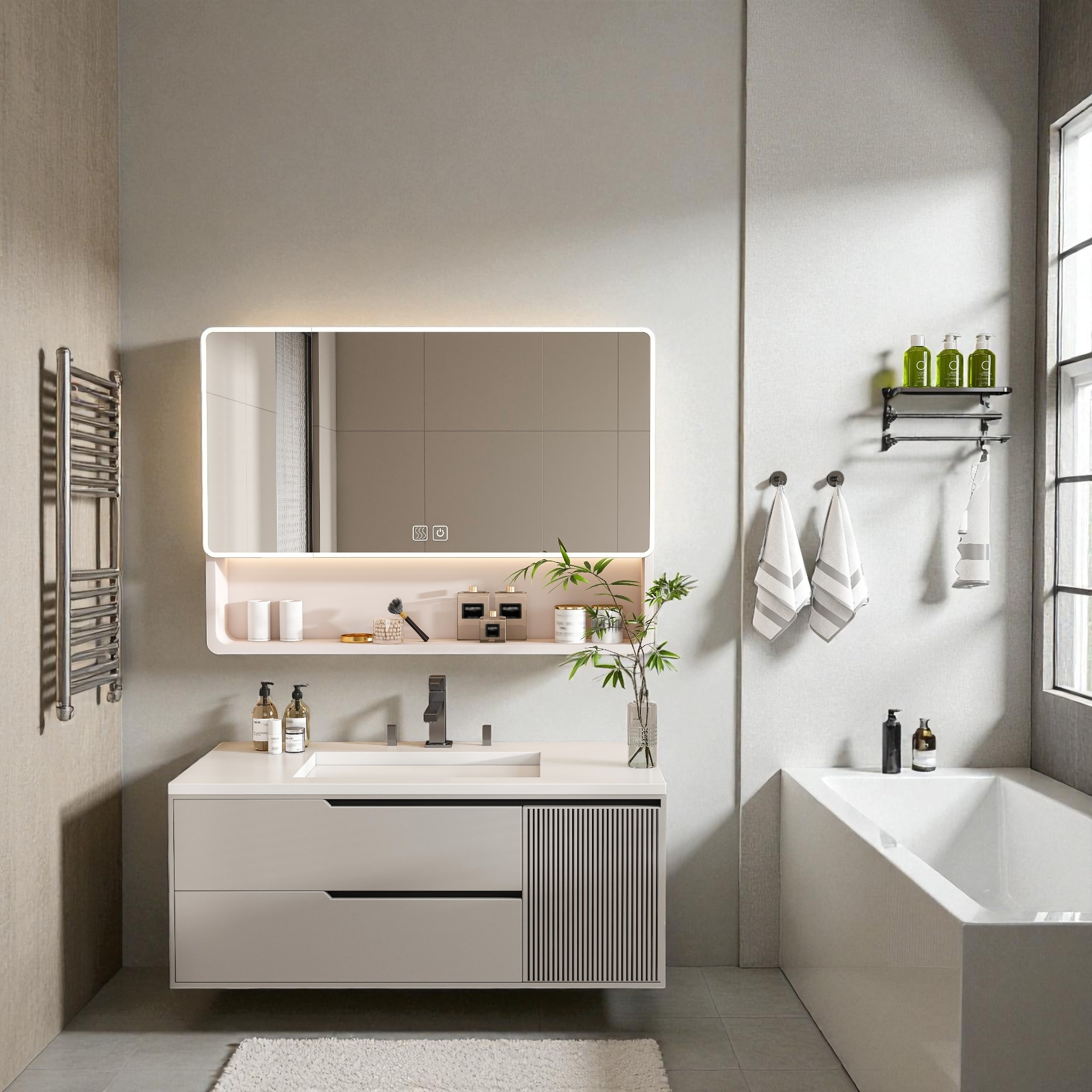 35 Inch Recessed or Surface Mount Medicine Cabinet with LED Light, Defogging, Cosmetic Storage Rack and Hair Dryer Holder