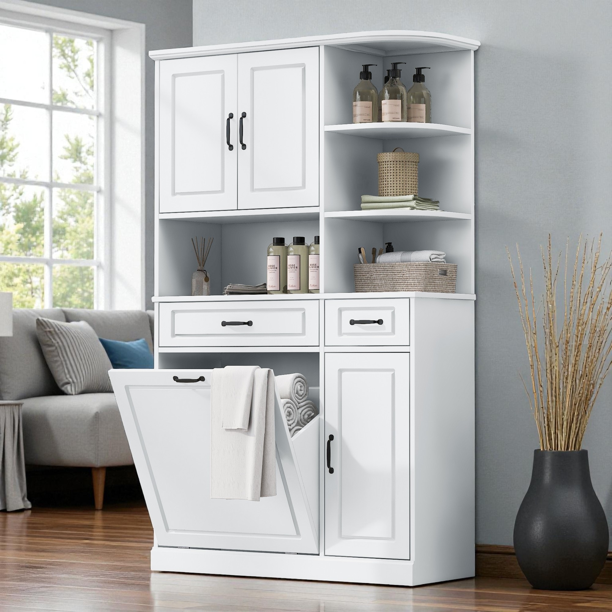 Tall Freestanding Storage Cabinet with Tilt-Out Hamper, Drawers, Adjustable Shelves, and Doors for Bathroom or Living Room - MDF