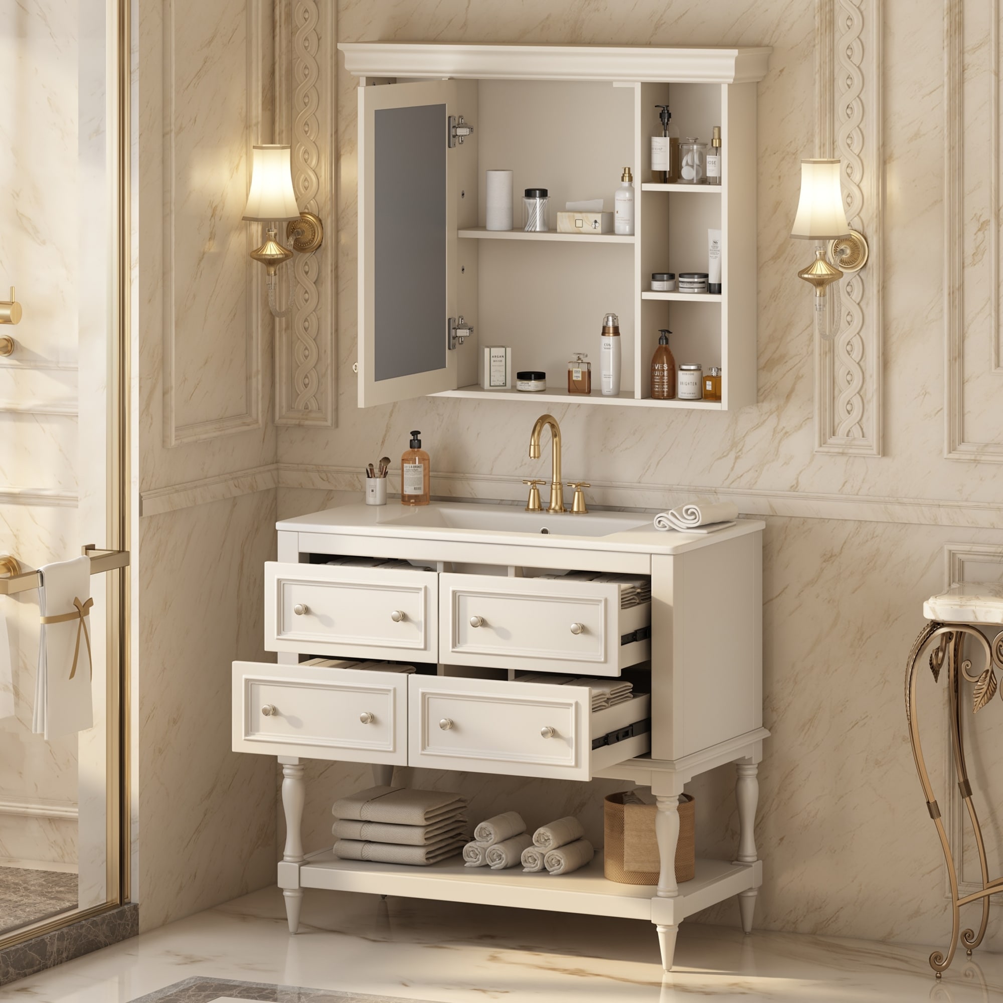 36'' Bathroom Vanity with Medicine Cabinet, Modern Mirror Cabinet with Adjustable Shelf, Bathroom Storage Cabinet with 4 Drawers