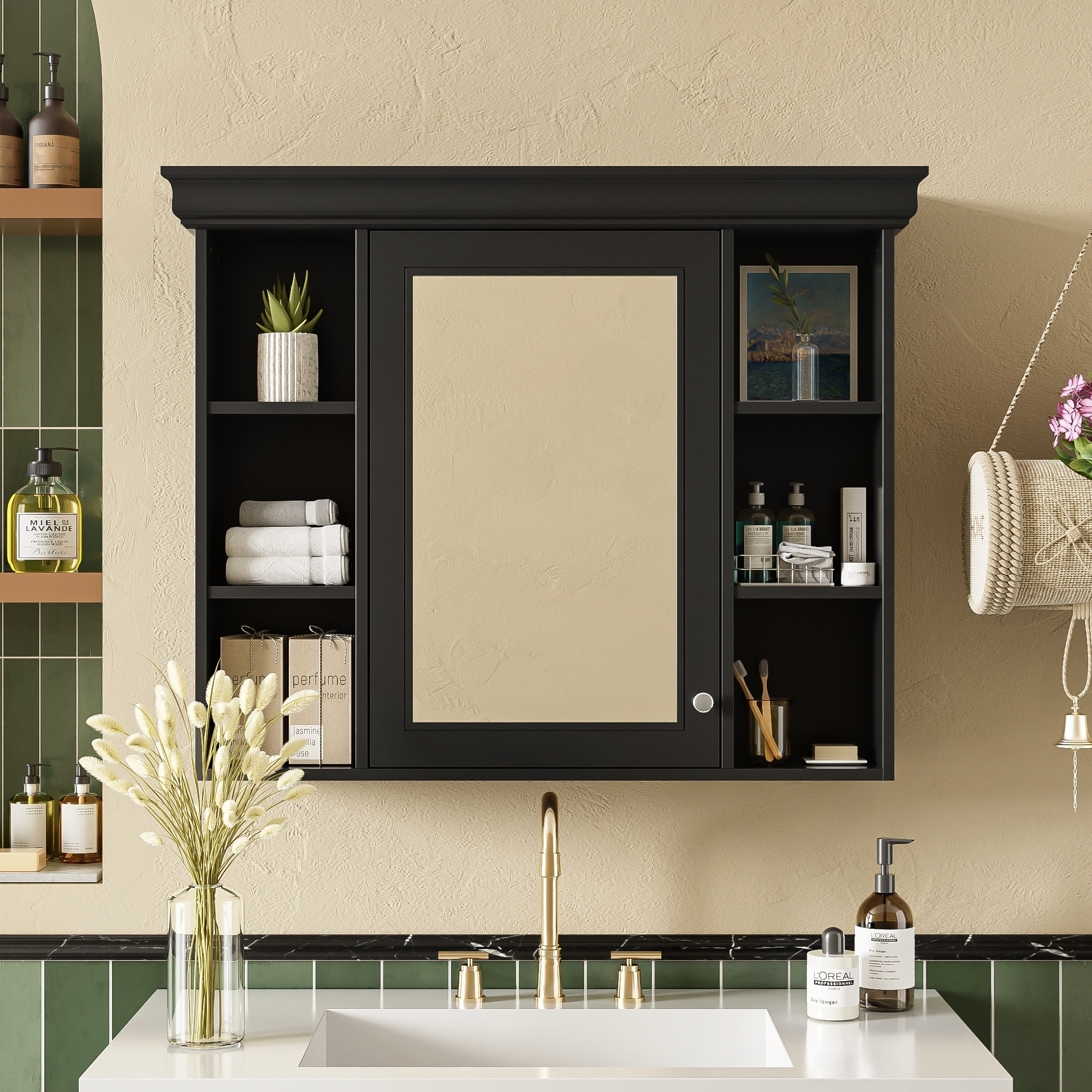 35'' x 27.5'' Wall Mounted Medicine Cabinet with Mirror, Modern Bathroom Storage Cabinet with 1 Door and 6 Open Shelves - MDF
