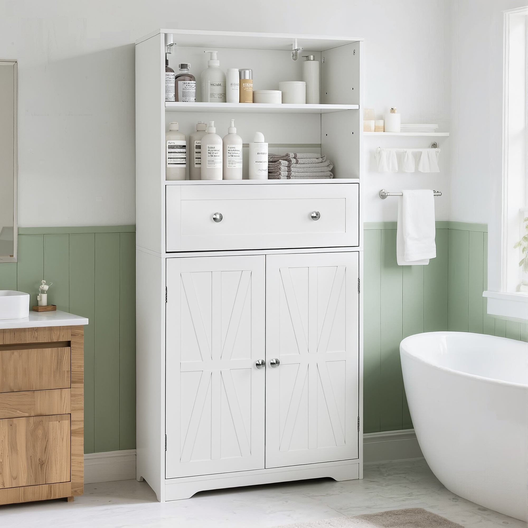 Javlergo White Adjustable Shelf Bathroom Cabinet with Drawer Tall Free Standing Bathroom Cabinet for Organization Living Room