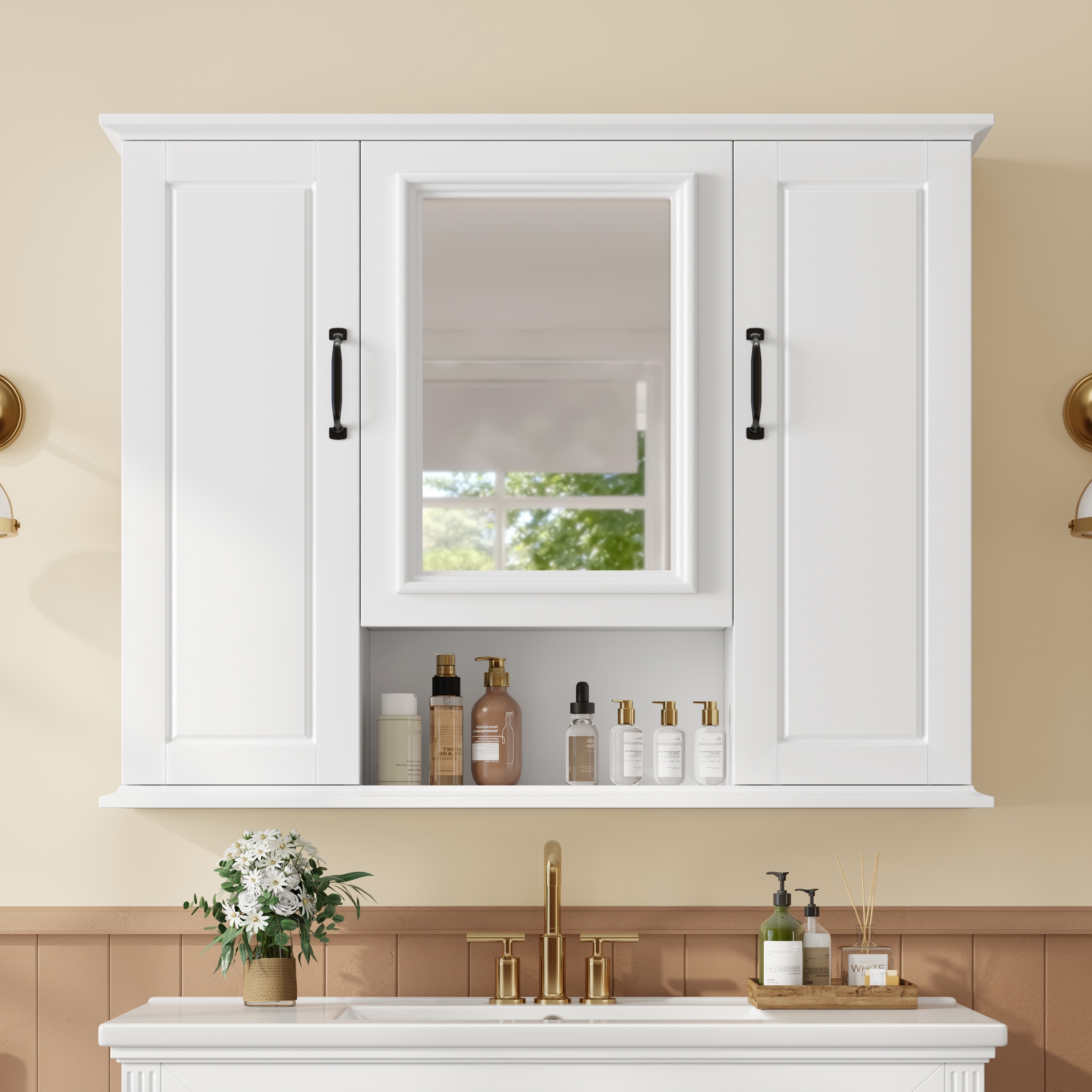 Roomfitters 36" Bathroom Medicine Cabinet, Textured Wall Mounted Mirror Cabinet with 3 Doors & Open Shelf