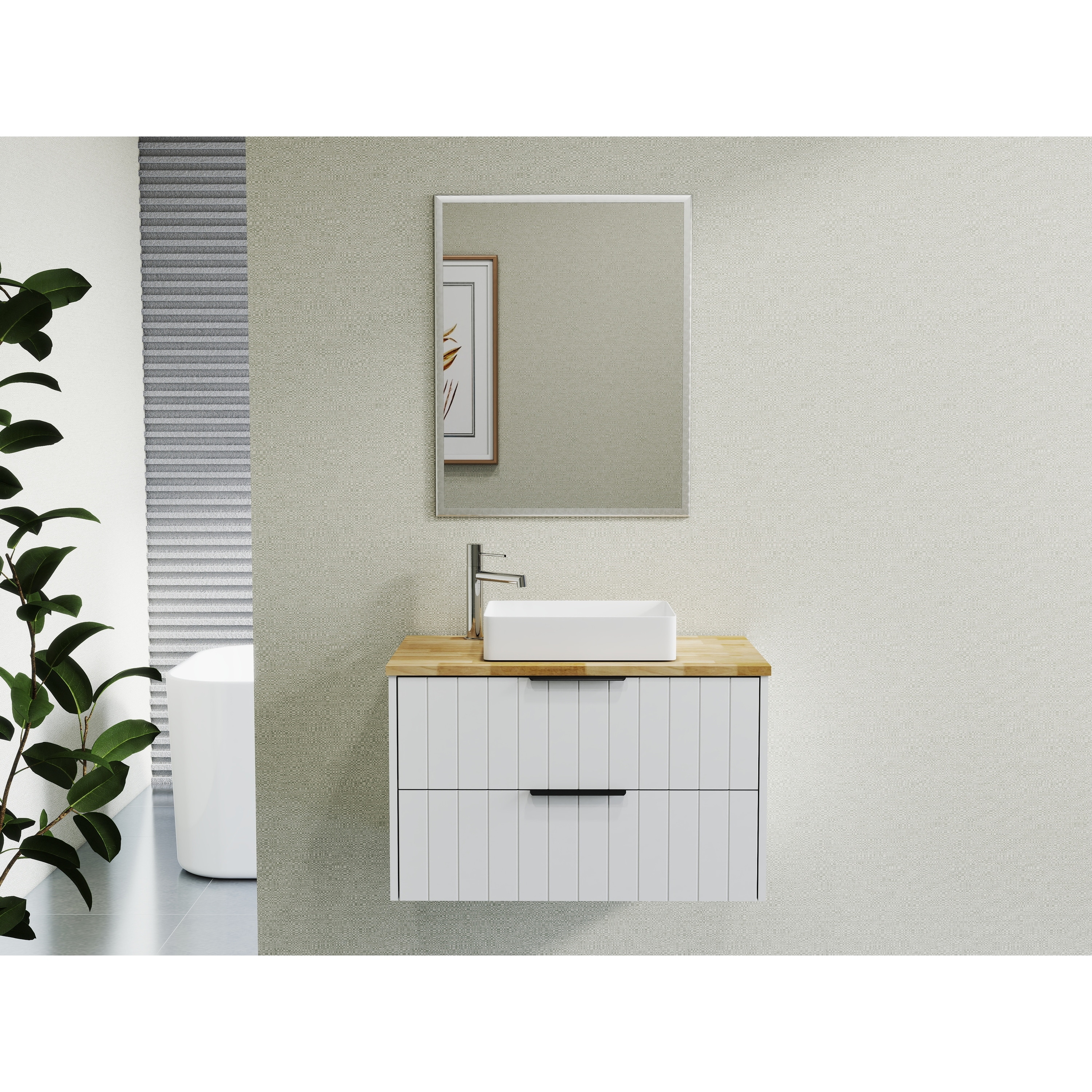 GDFStudio - 32-Inch Wall-Mounted Bathroom Vanity, Solid Wood Natural Top, Square Art Ceramic Sink