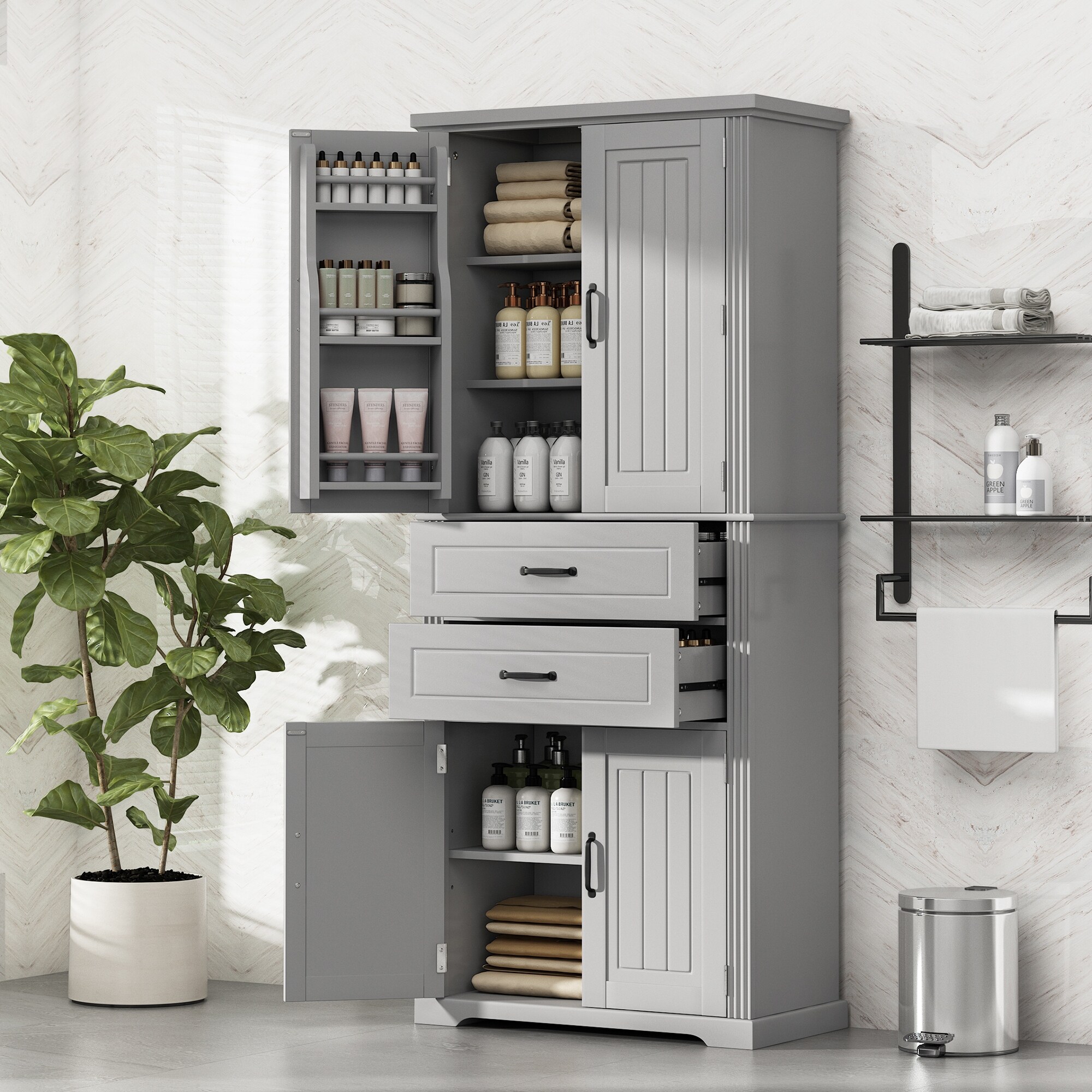67" Tall Bathroom Storage Cabinet, Freestanding Linen Cabinet with Glass Doors and Shelves, Bathroom Cabinet with 2 Drawers