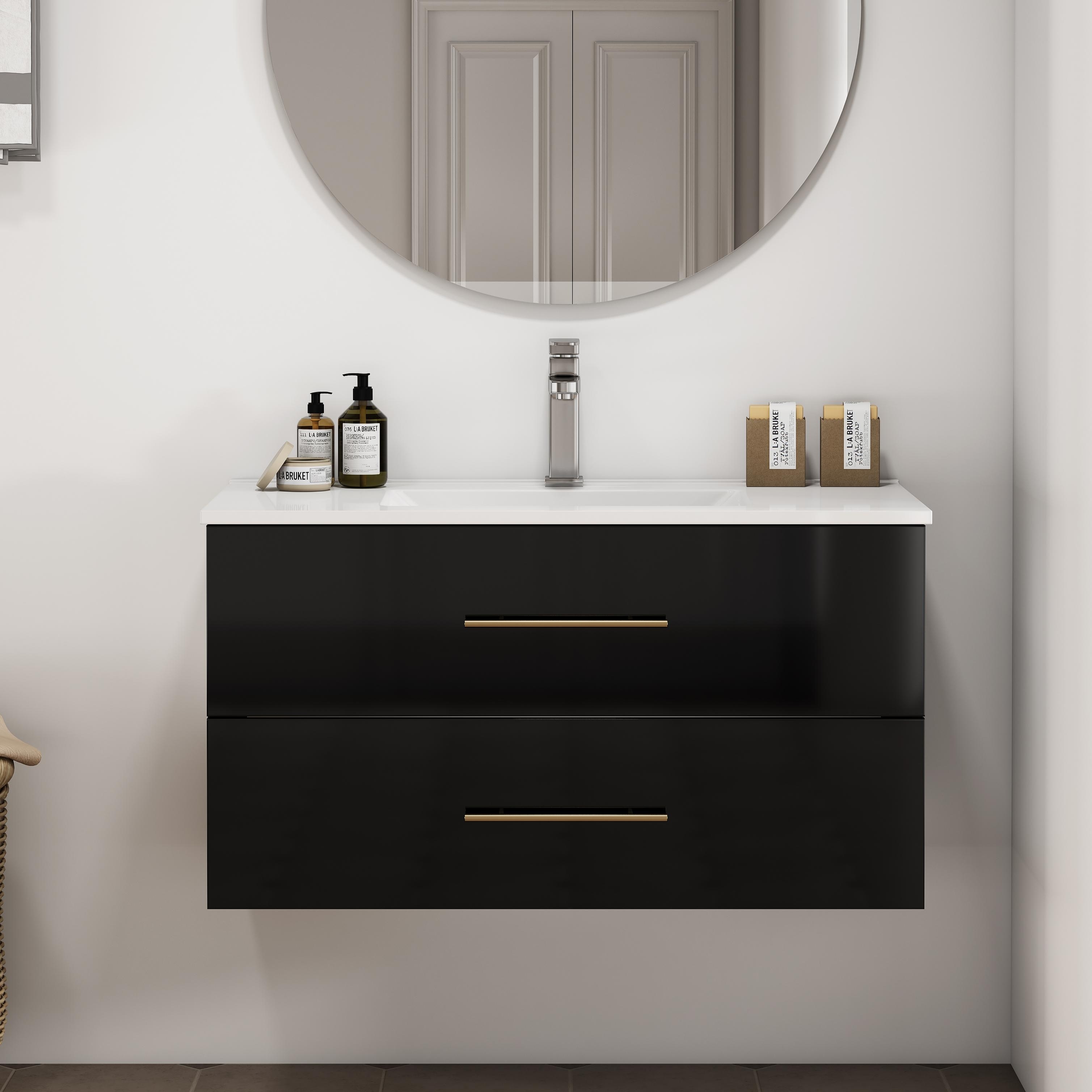 36-Inch Gloss Wall-Mounted Bathroom Vanity with Sink Combo,Double Drawers,Ceramic Sink,Long Gold Metal Handle,Easy Installation