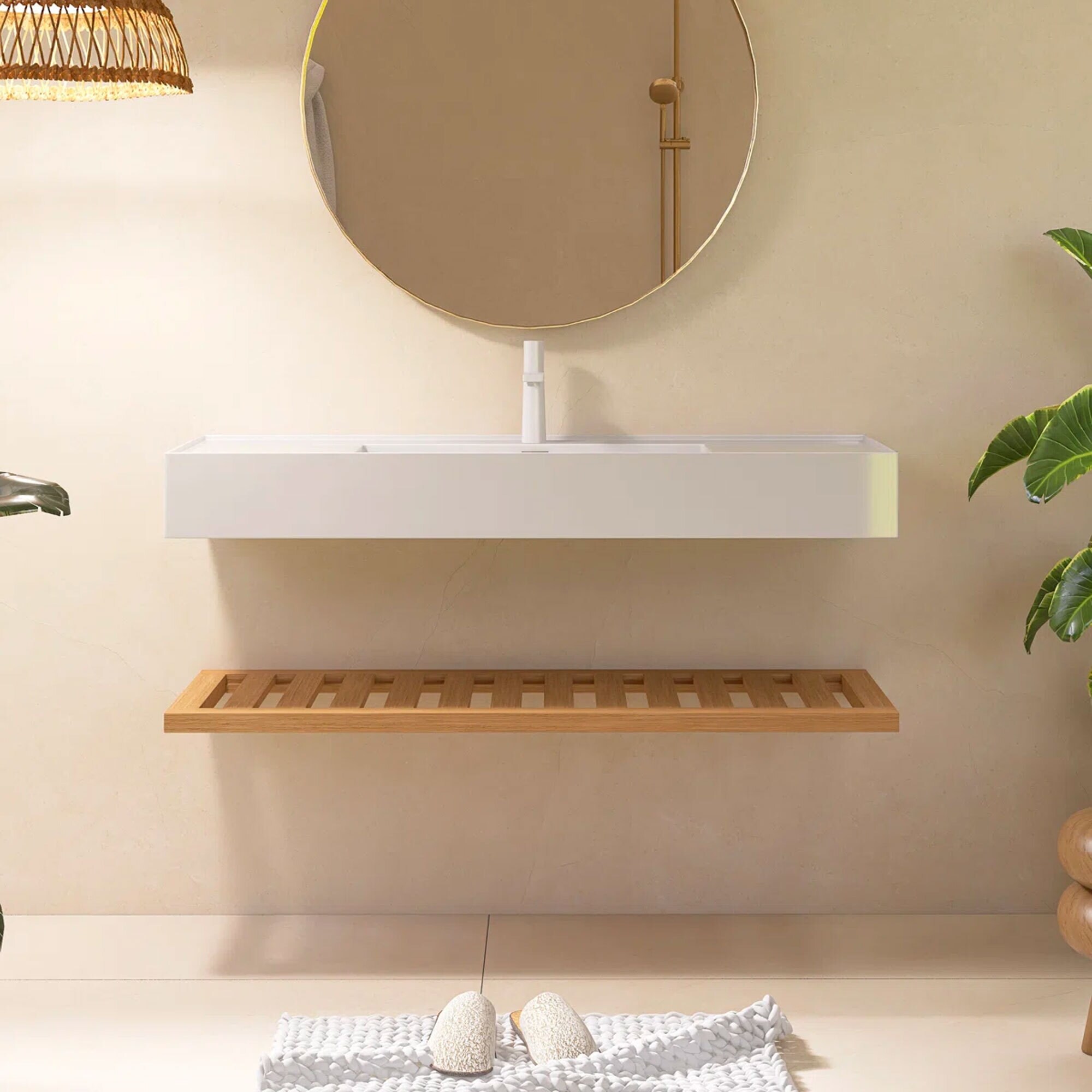 Wall-Mounted Bathroom Vanity in Natural Wood with White Integrated Acrylic Sink