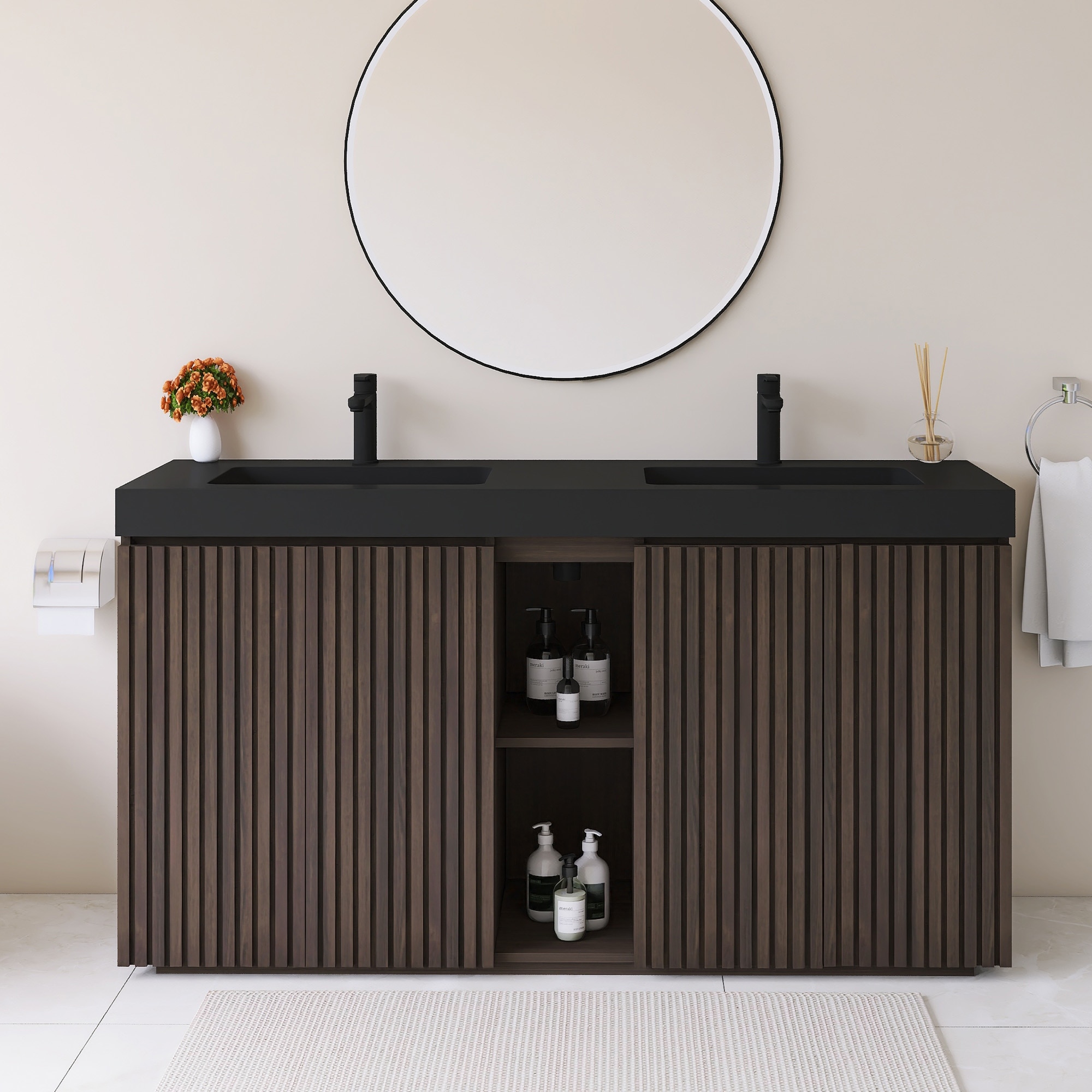 59.5'' Freestanding Bathroom Vanity with Black Integrated Solid Surface Sink in Smoked Oak - 59.49'' x 19.11'' x 36.45''