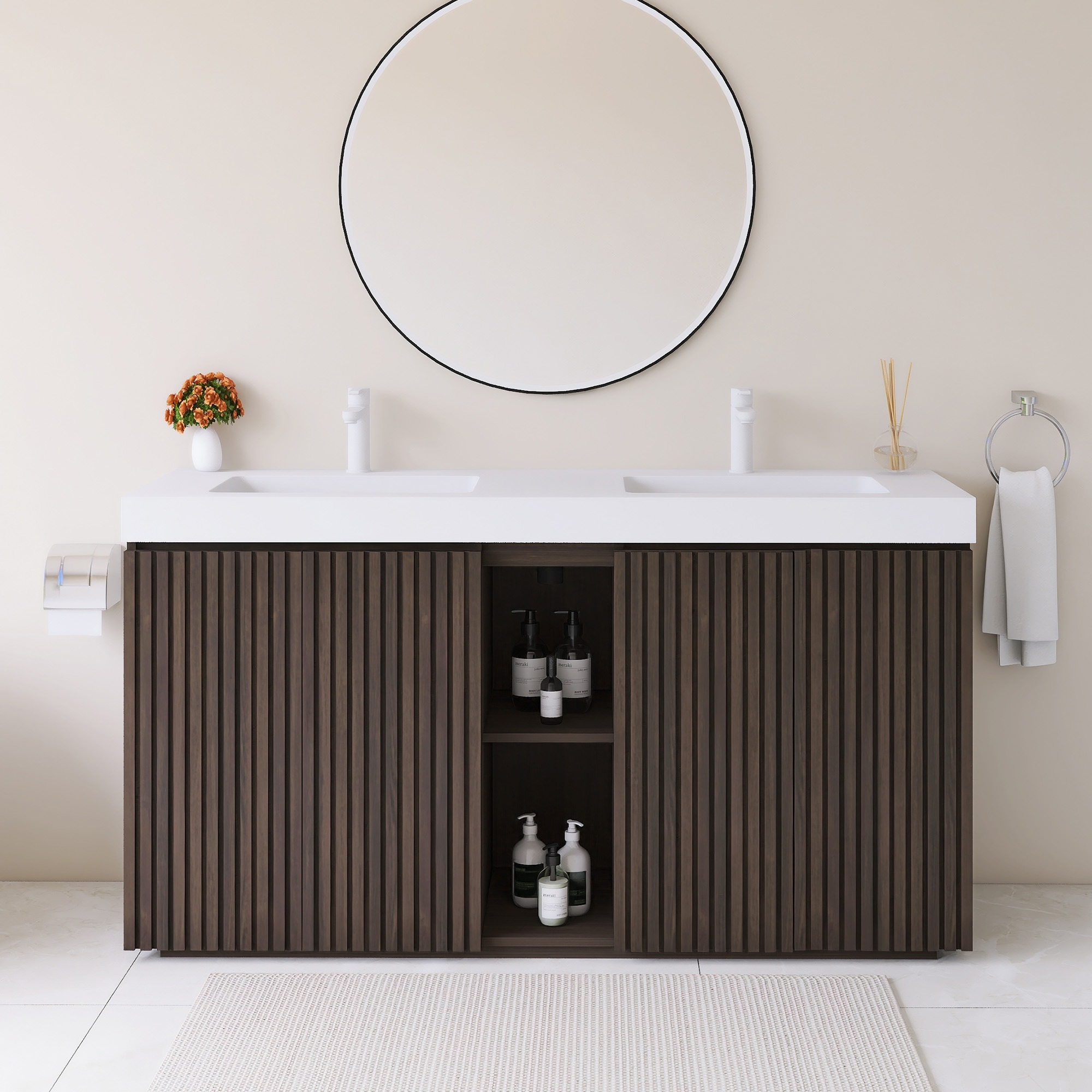 59.5'' Freestanding Bathroom Vanity with White Integrated Solid Surface Sink in Smoked Oak - 59.49'' x 19.11'' x 36.45''