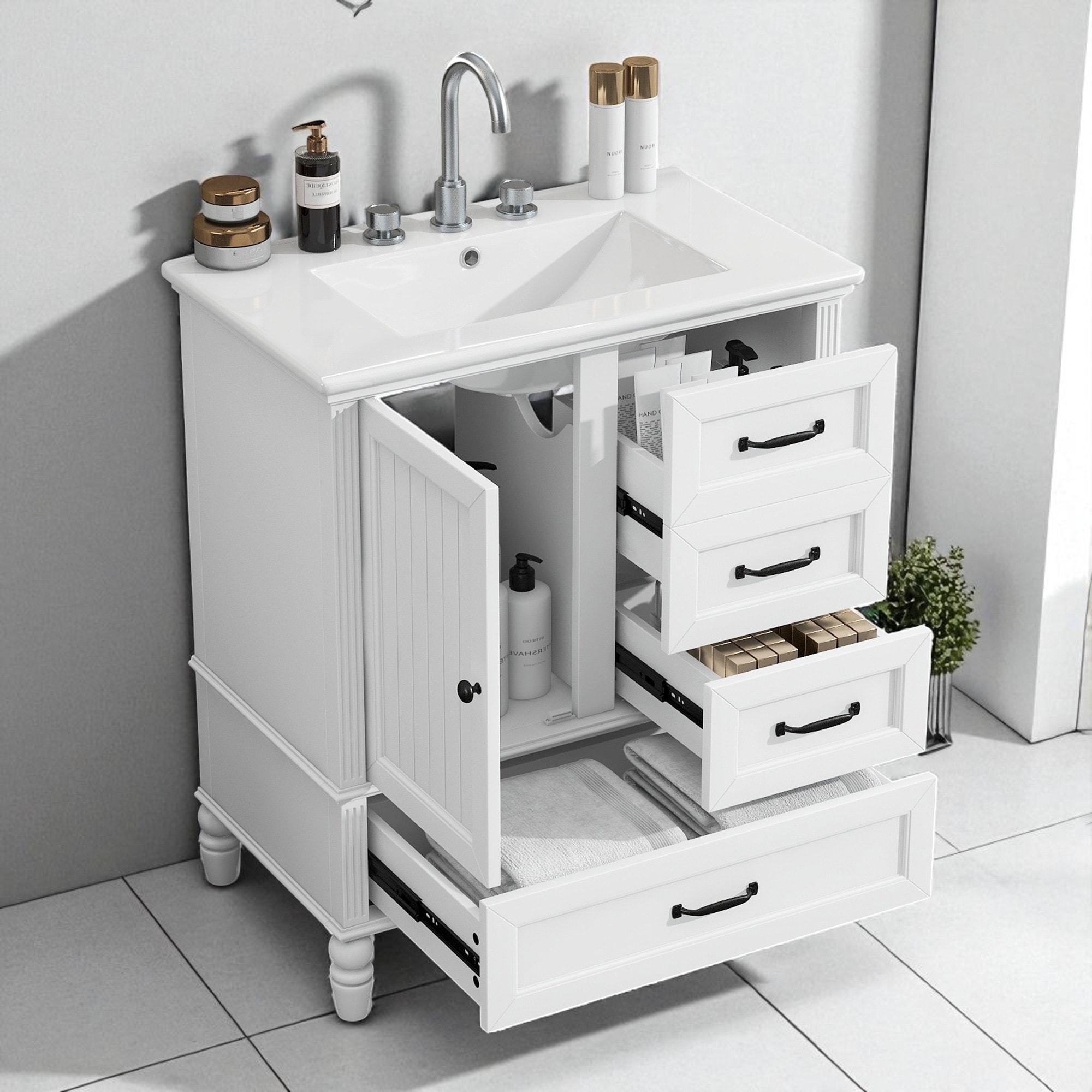Freestanding 30" Bathroom Vanity with Sink, 3 Drawers, 1 Door, Soft-Close, Solid Wood Legs, Ceramic Top, MDF Cabinet