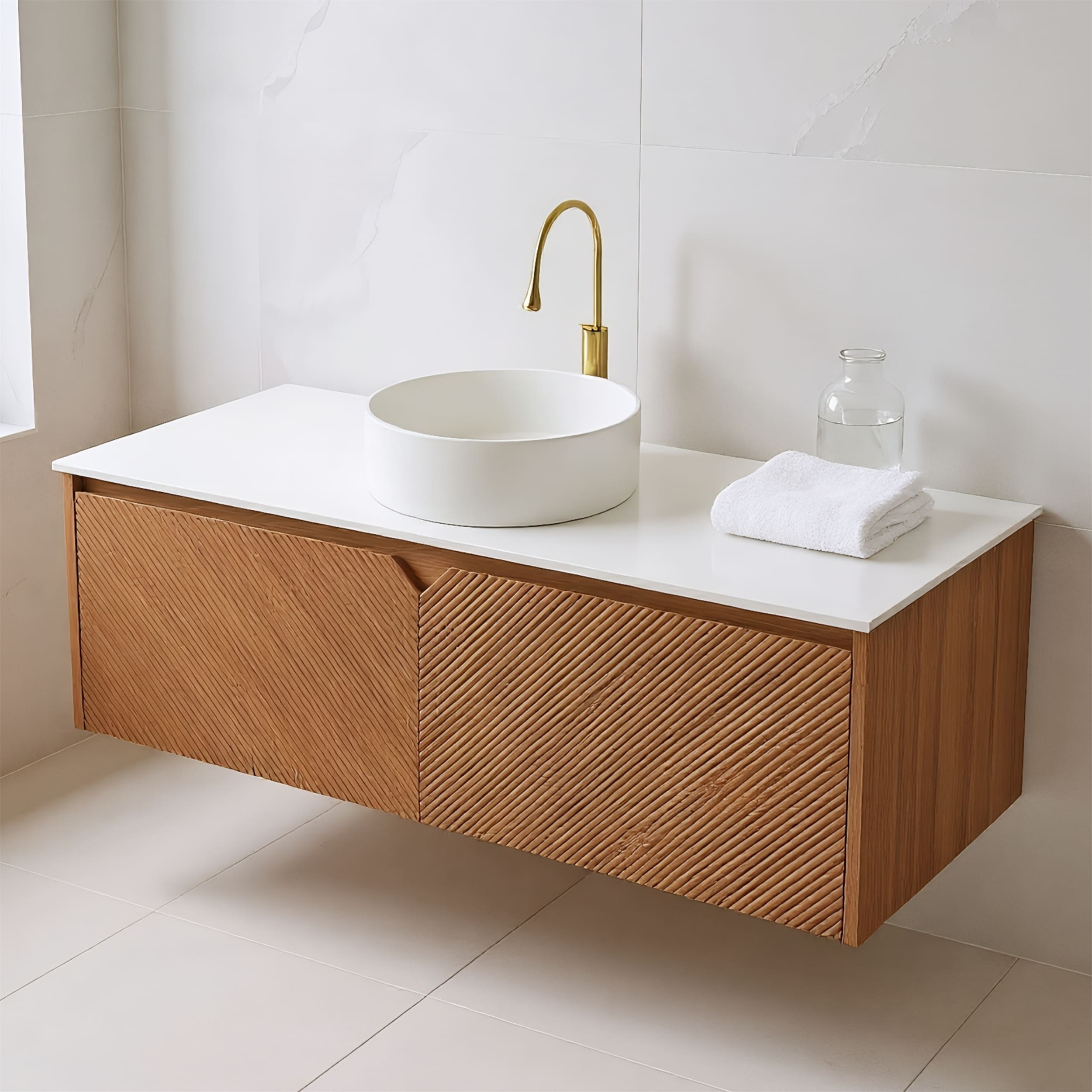 48" Wall-Mounted Bathroom Vanity with Brown Oak Cabinet and Stone Top - 48 in