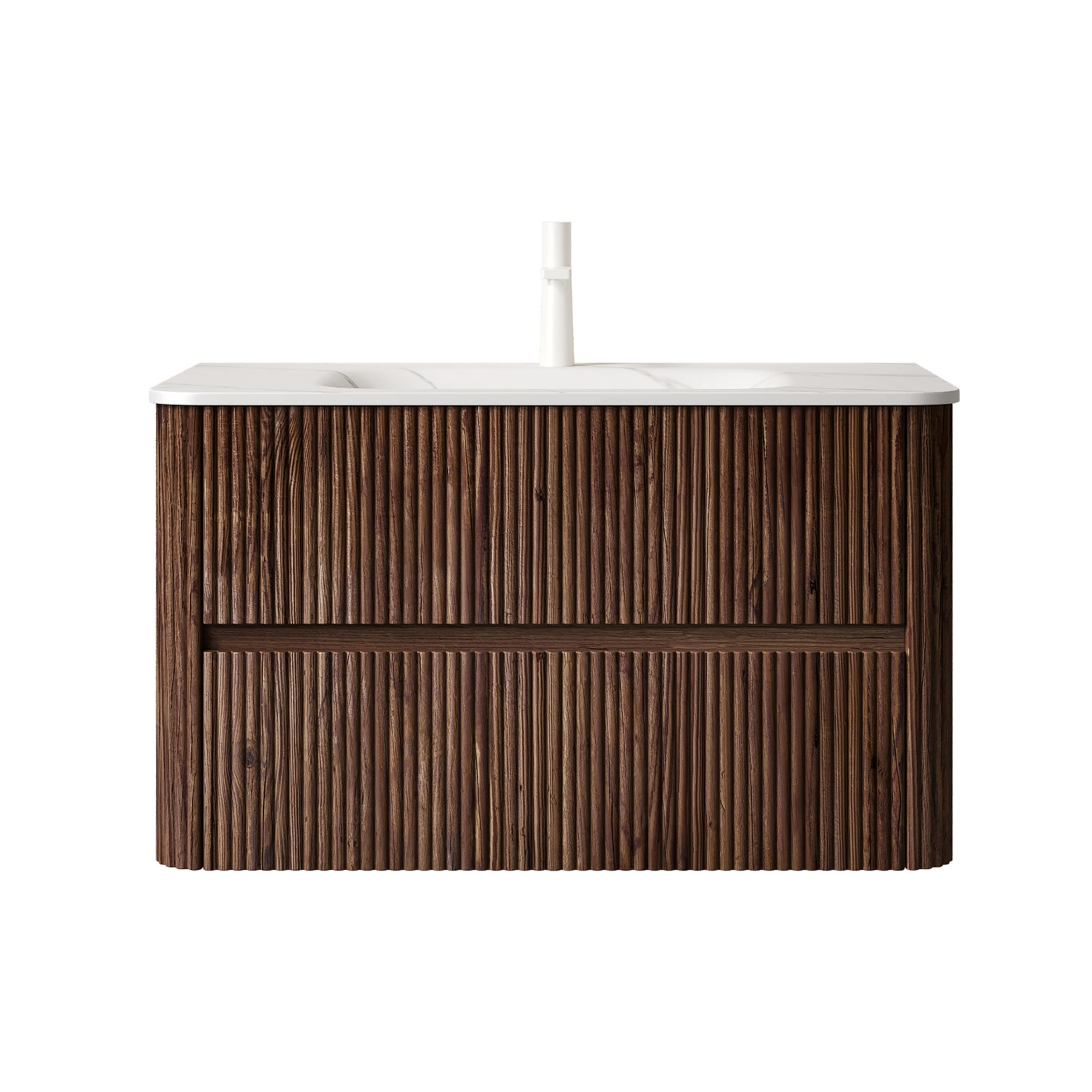 Wall-Mounted Vanity, Carrara Sintered Stone Top & Retro Walnut Drawers
