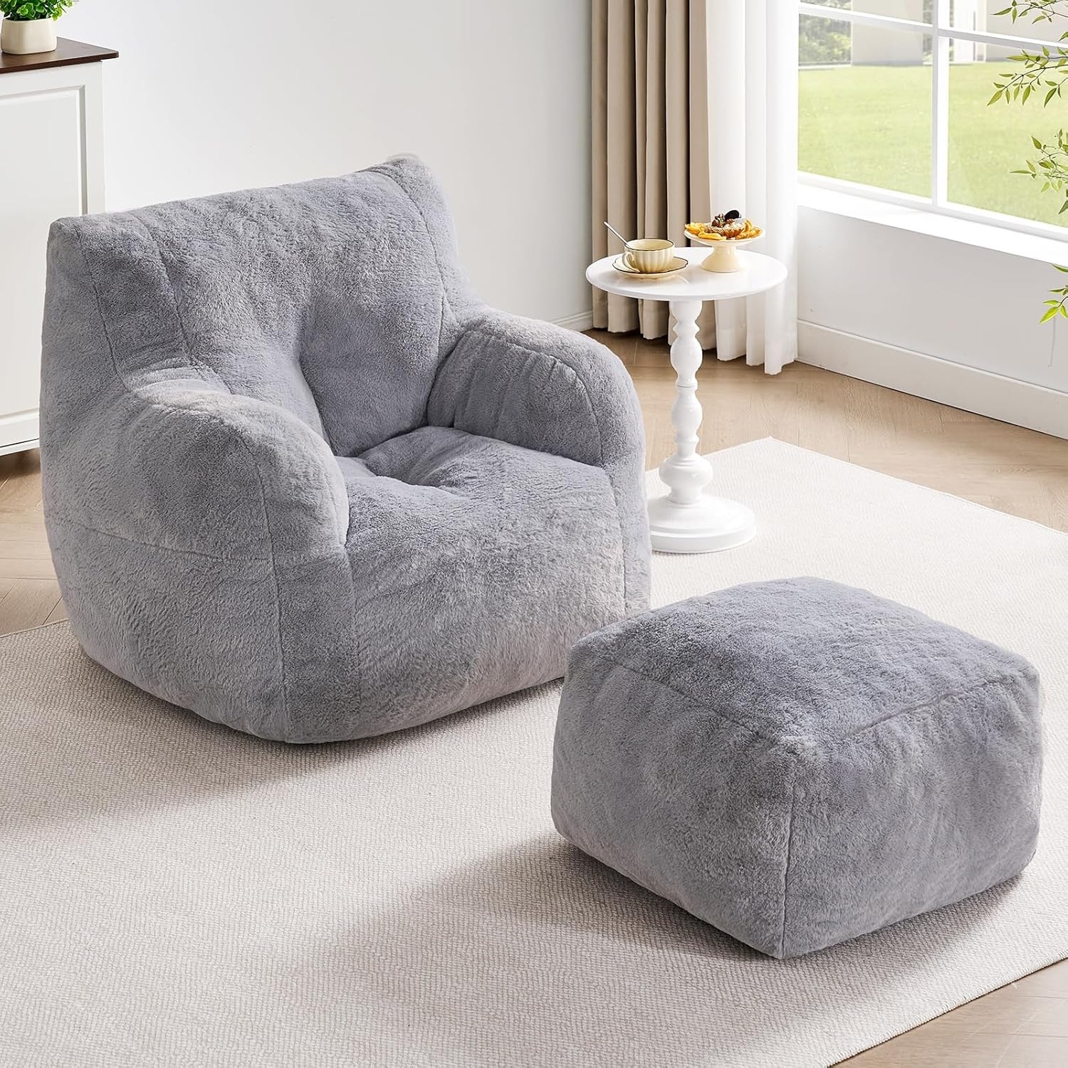Large Bean Bag Chair with Ottoman - Memory Foam Faux Fur Lounge Sofa for Living Room, Bedroom & Game Room
