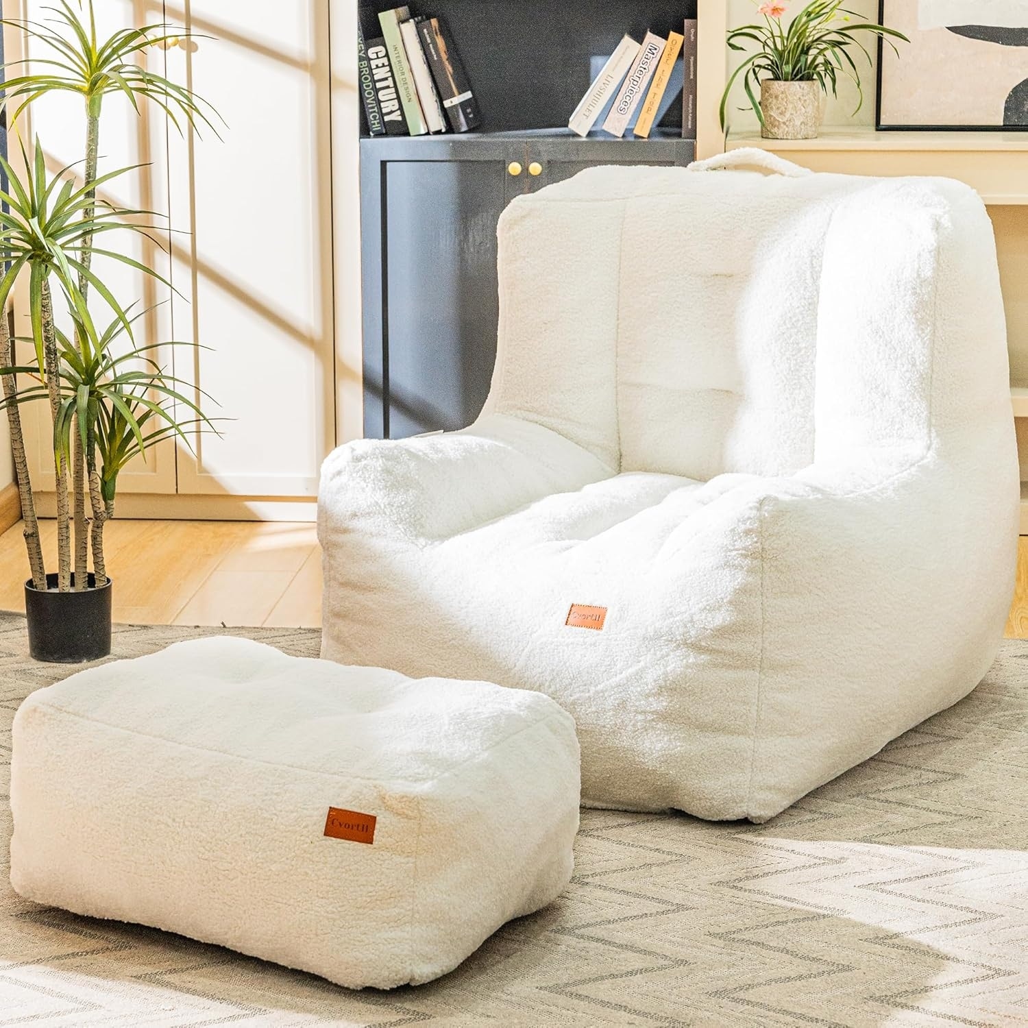 Oversized Bean Bag Chair with Ottoman, Cozy Floor Sofa for Bedroom or Living Room, White