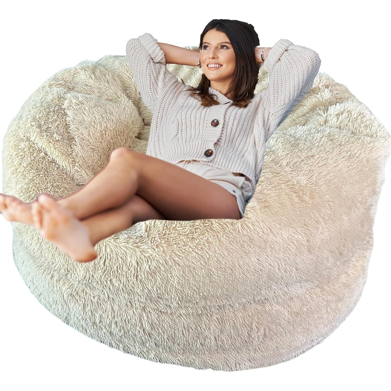 Fluffy Bean Bag Chair Cover for Adults Teens or Kids, xl Faux Fur Stuffed Animal Storage (Beige, 4 ft (Cover Only))