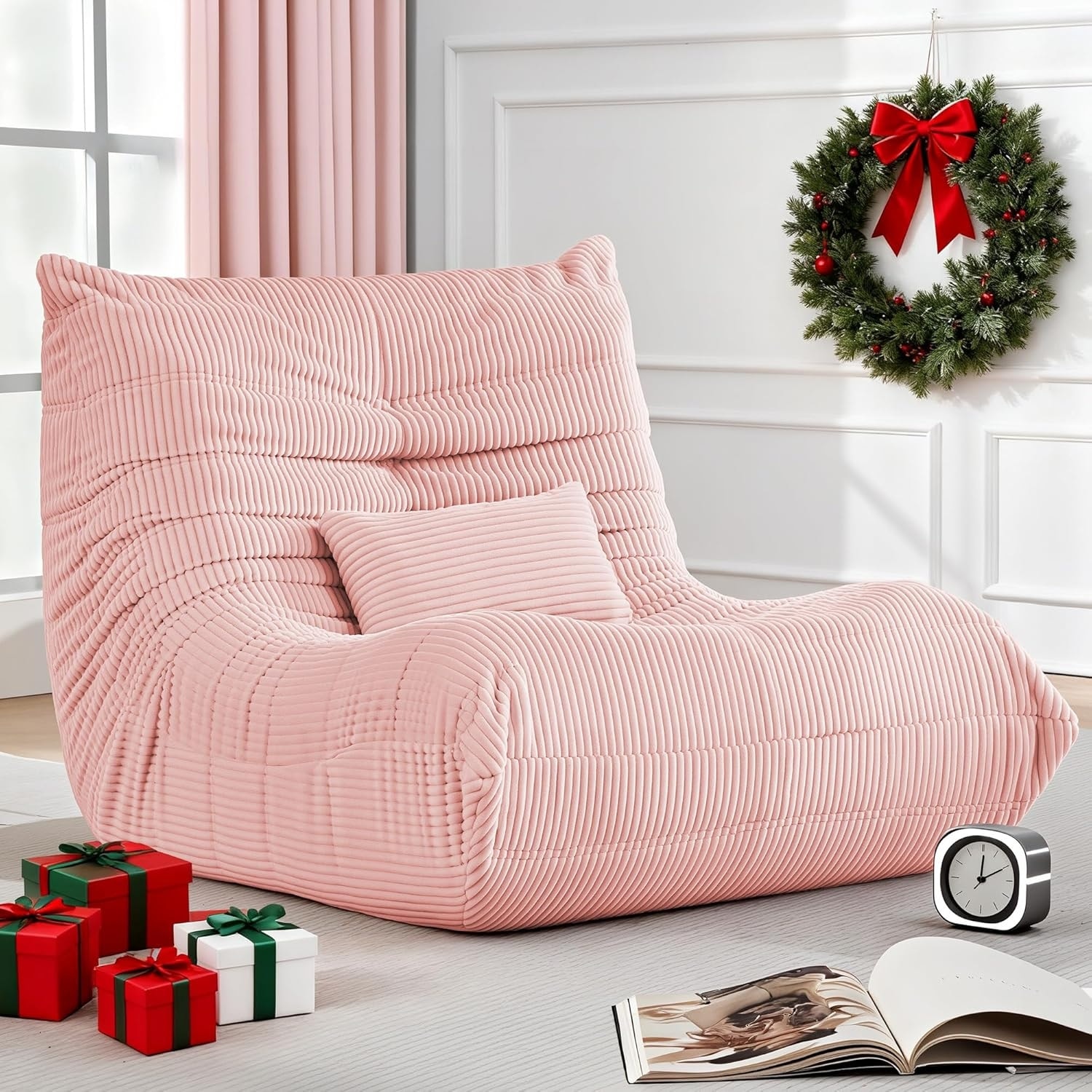 Oversized Bean Bag Chair with Lumbar Pillow, Corduroy Memory Foam Floor Sofa for Reading, Gaming, Living Room, Bedroom - Pink