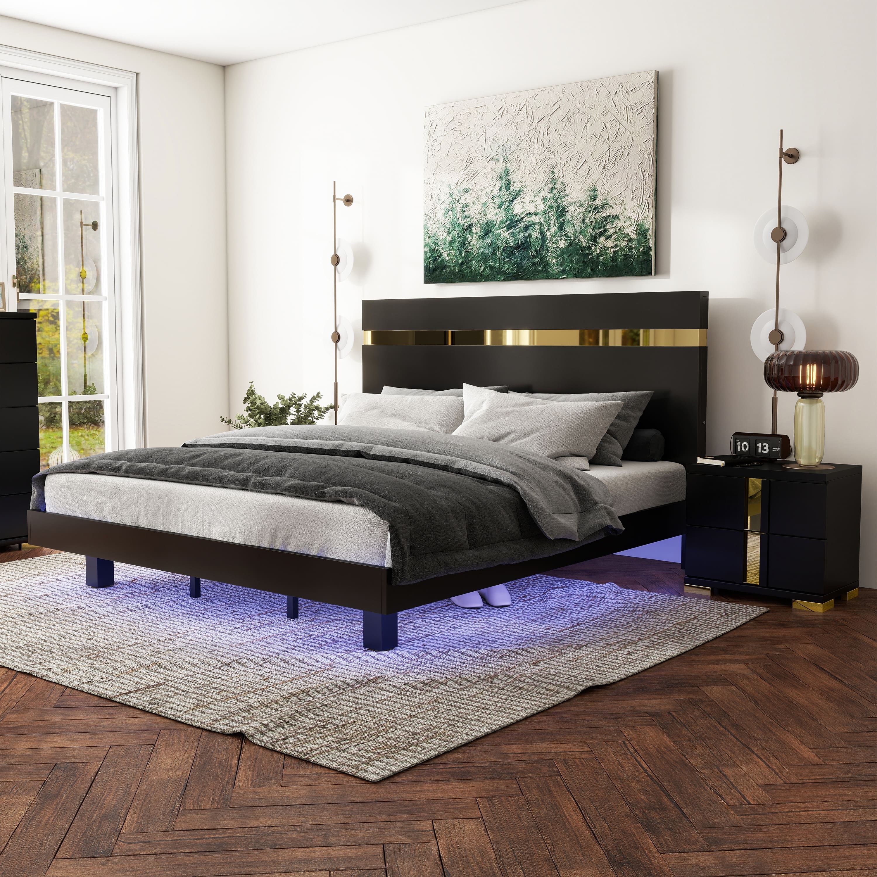 3 peice bedroom set Floating Bed Frame with Storage Headboard and 2 LED Nightstand With 3 Drawers