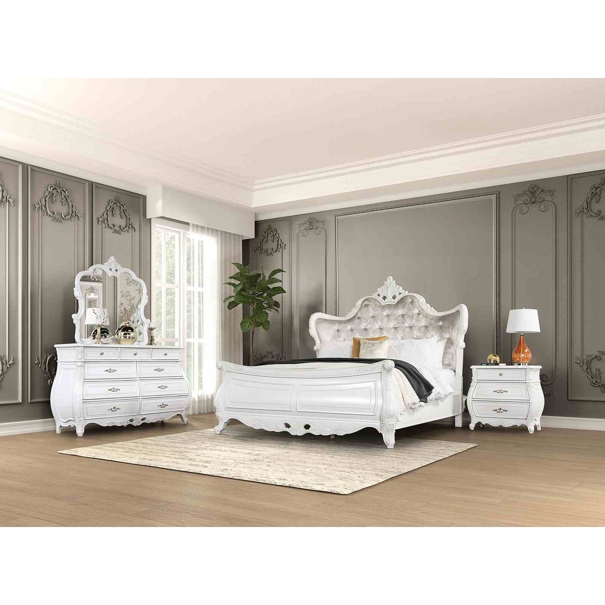 Formal Traditional White and Tan Finish Bedroom Furniture Set with Wingback Bed