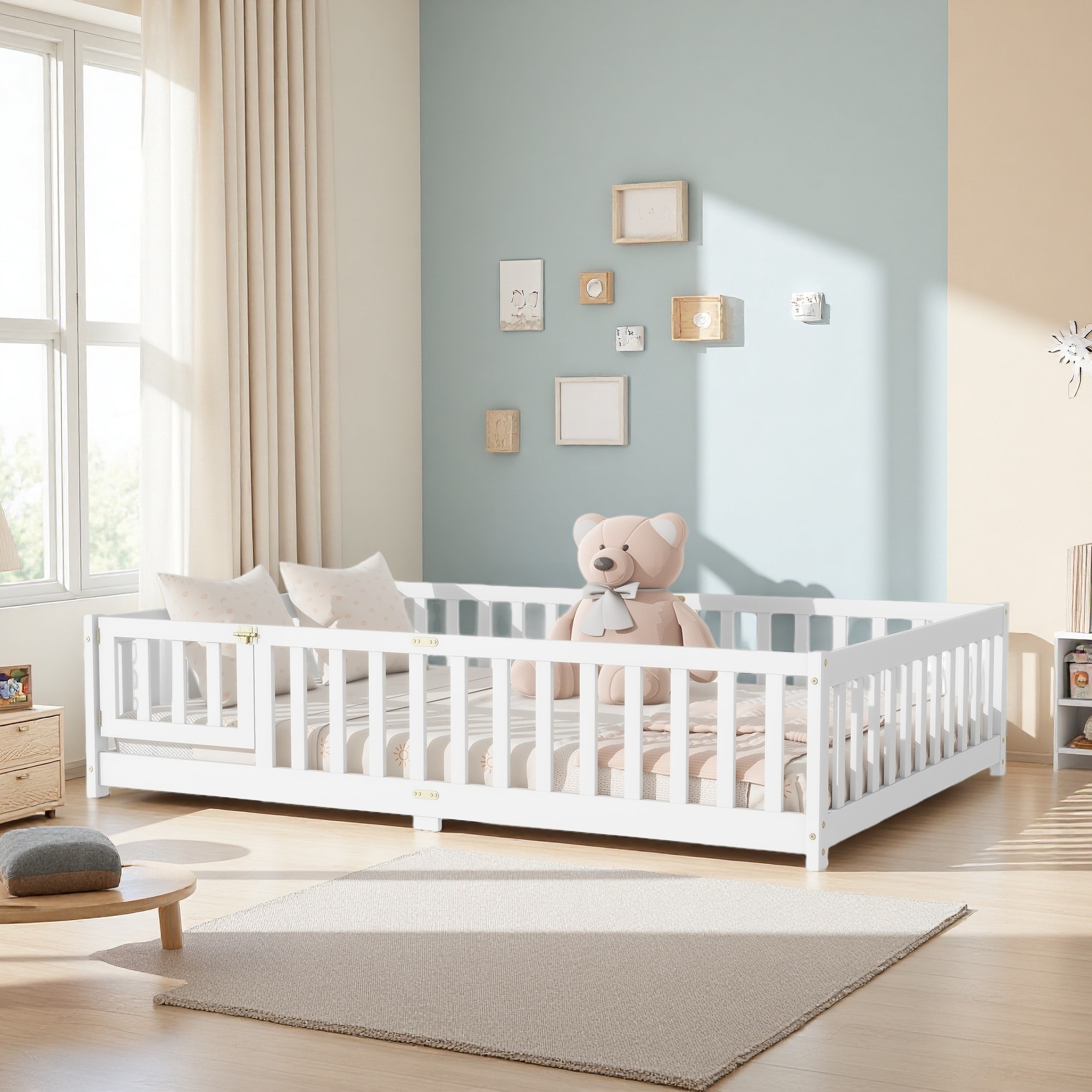 Full Size Floor Bed with Fence & Door, Rubber Wood