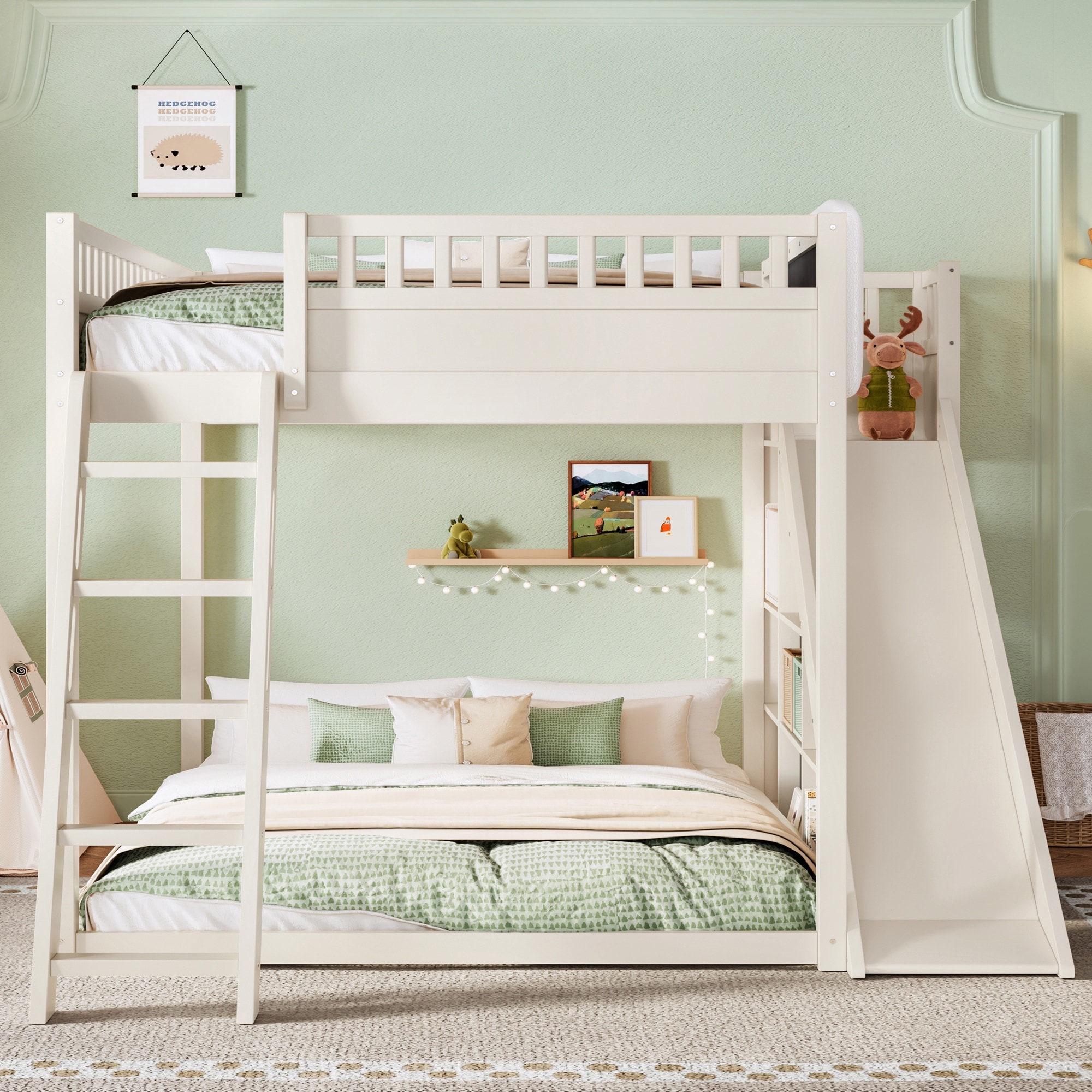 Loft Bed Wood Bed Frame with Storage Shelves & Slide for Kids, Teens