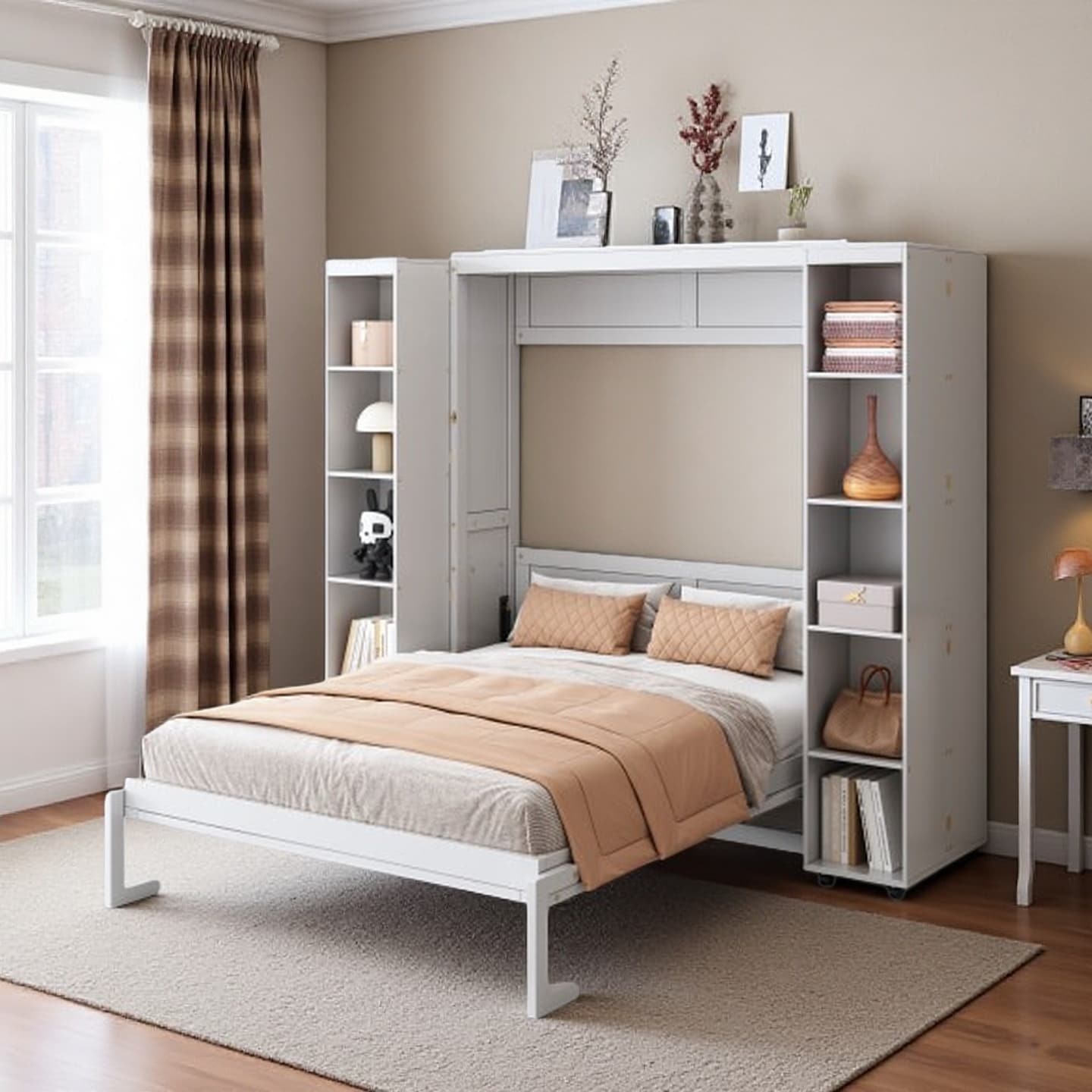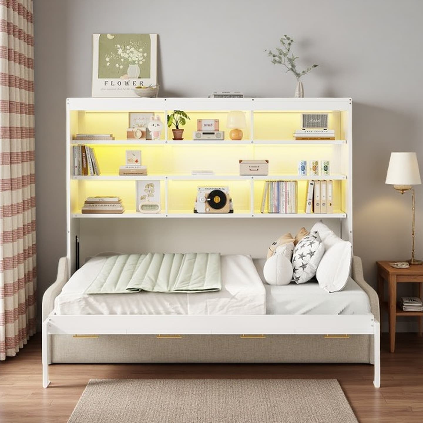 Beige Murphy Bed with Foldable Sofa, Built-In Storage Shelves, and LED Lighting, Space-Saving Wall Bed for Small Rooms
