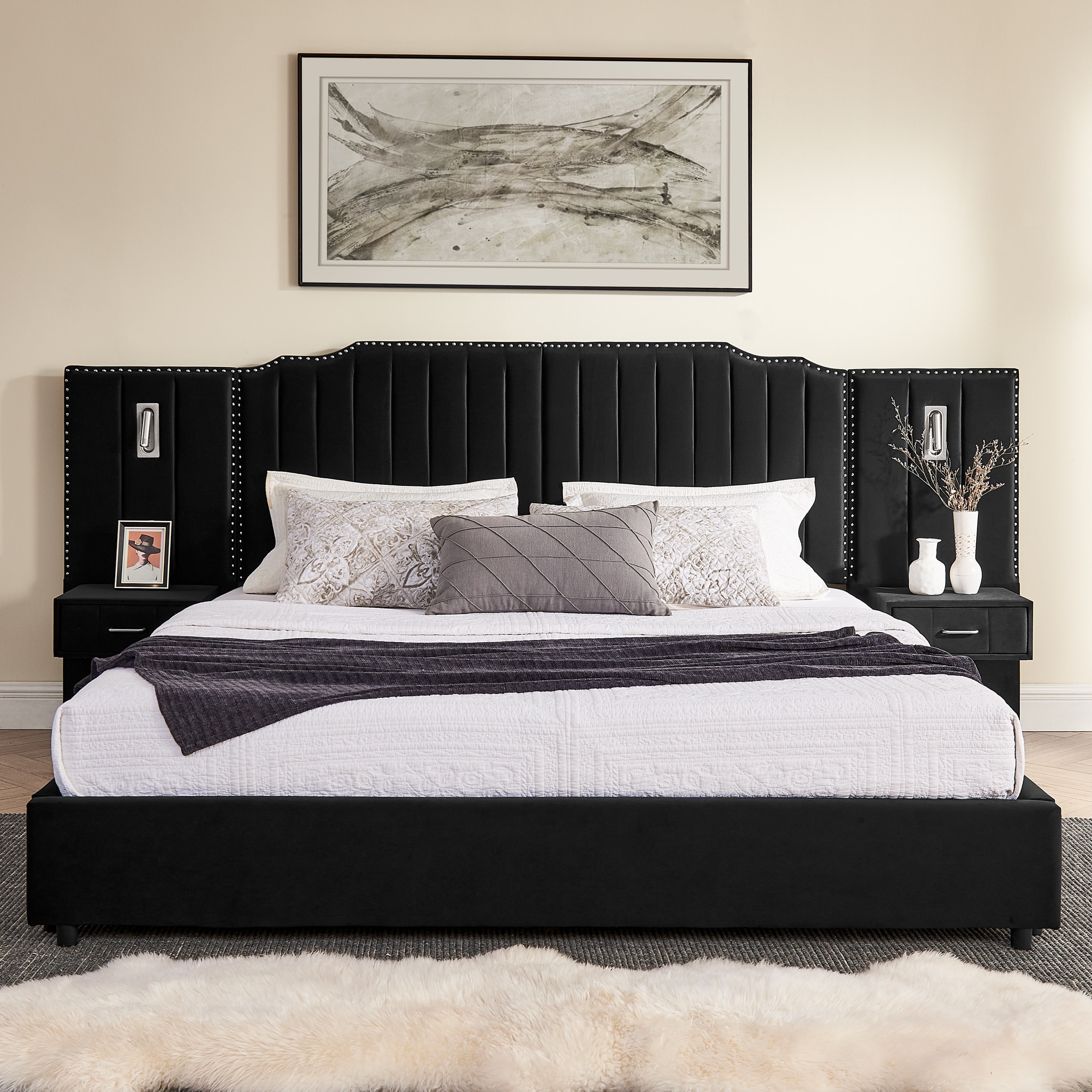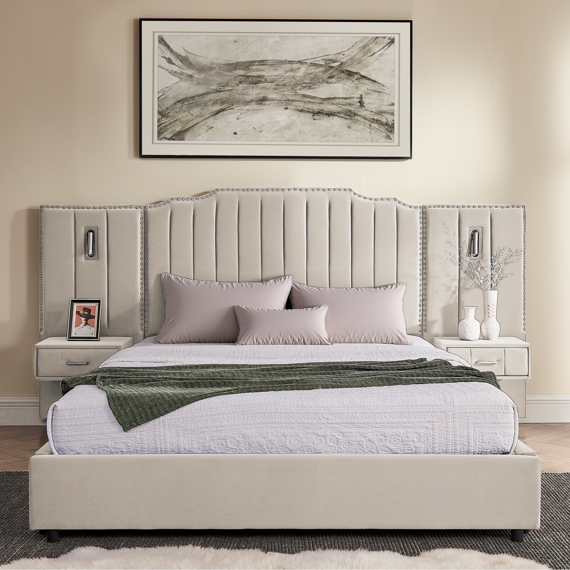 Velvet Upholstered Bed Frame with Oversized Headboard, Adjustable Bedside Lamp and 2 Nightstands, Vertical Stripe Design