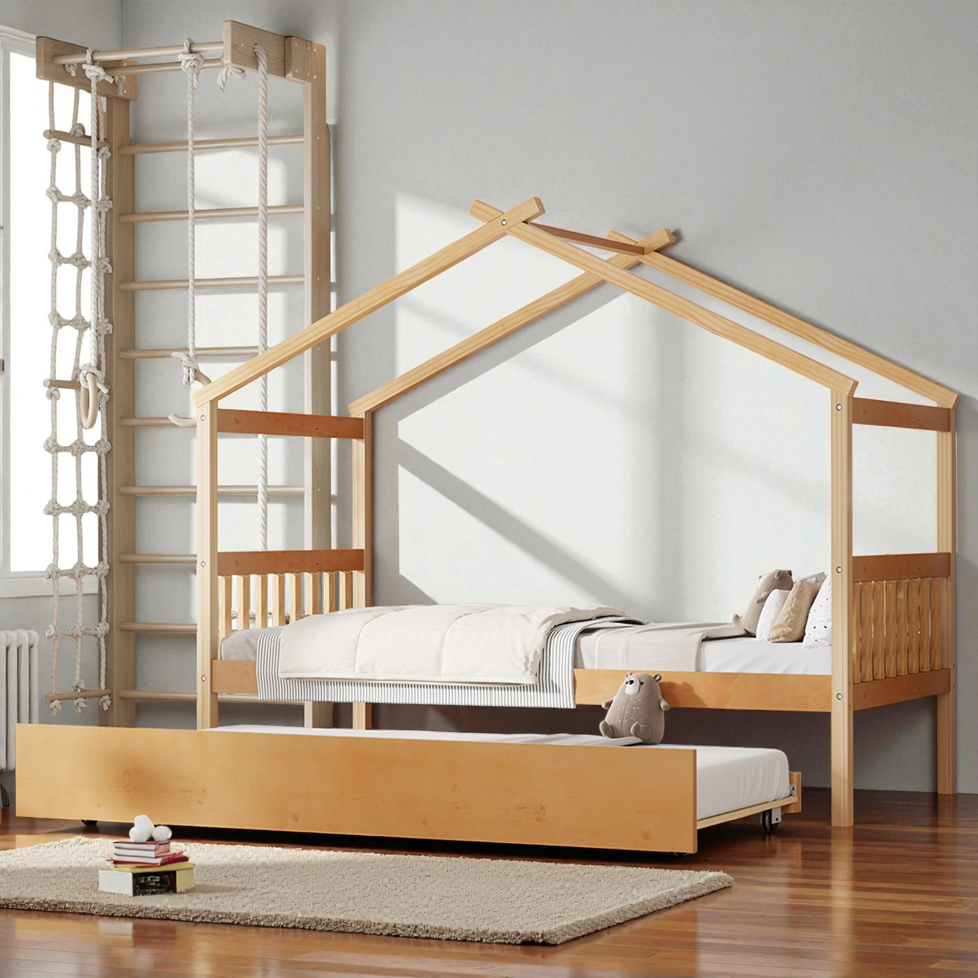 Twin Size Wooden House Bed with Trundle, Roof Frame and Headboards, Slat Support Daybed for Kids or Guest Room
