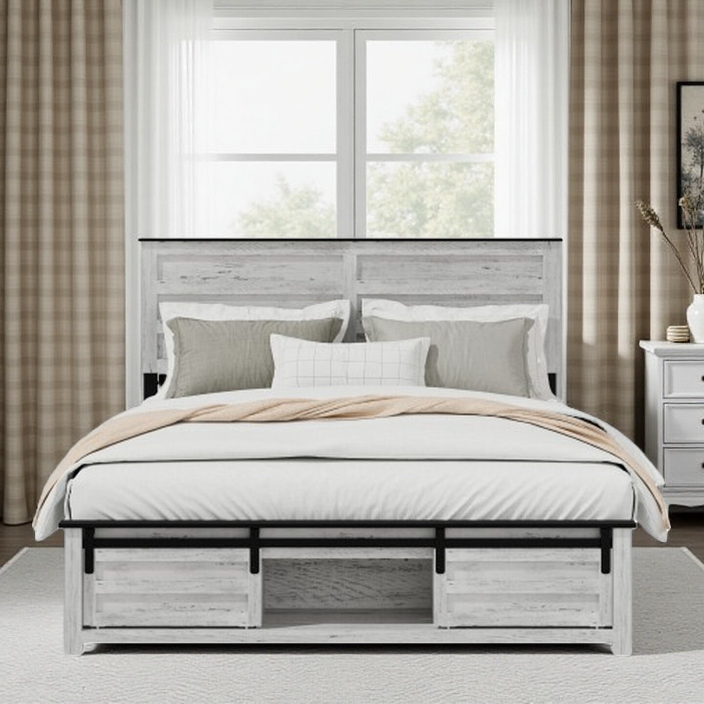 Farmhouse Queen Platform Bed in Stone Brown with Built-In LED Lighting and High Headboard, Easy Assembly