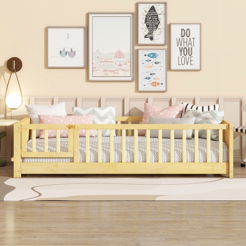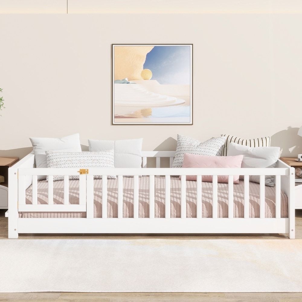 Twin/Full Size House Floor Bed with Tent and Light, Childlike Design Teepee Bed Montessori Bed with Full-length Guardrails