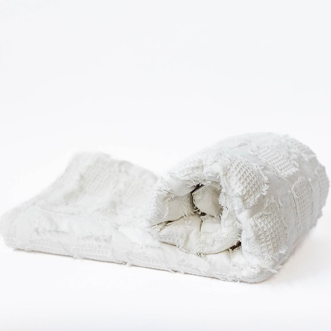 White With Square Waffle Print And Fine Fringe Throw