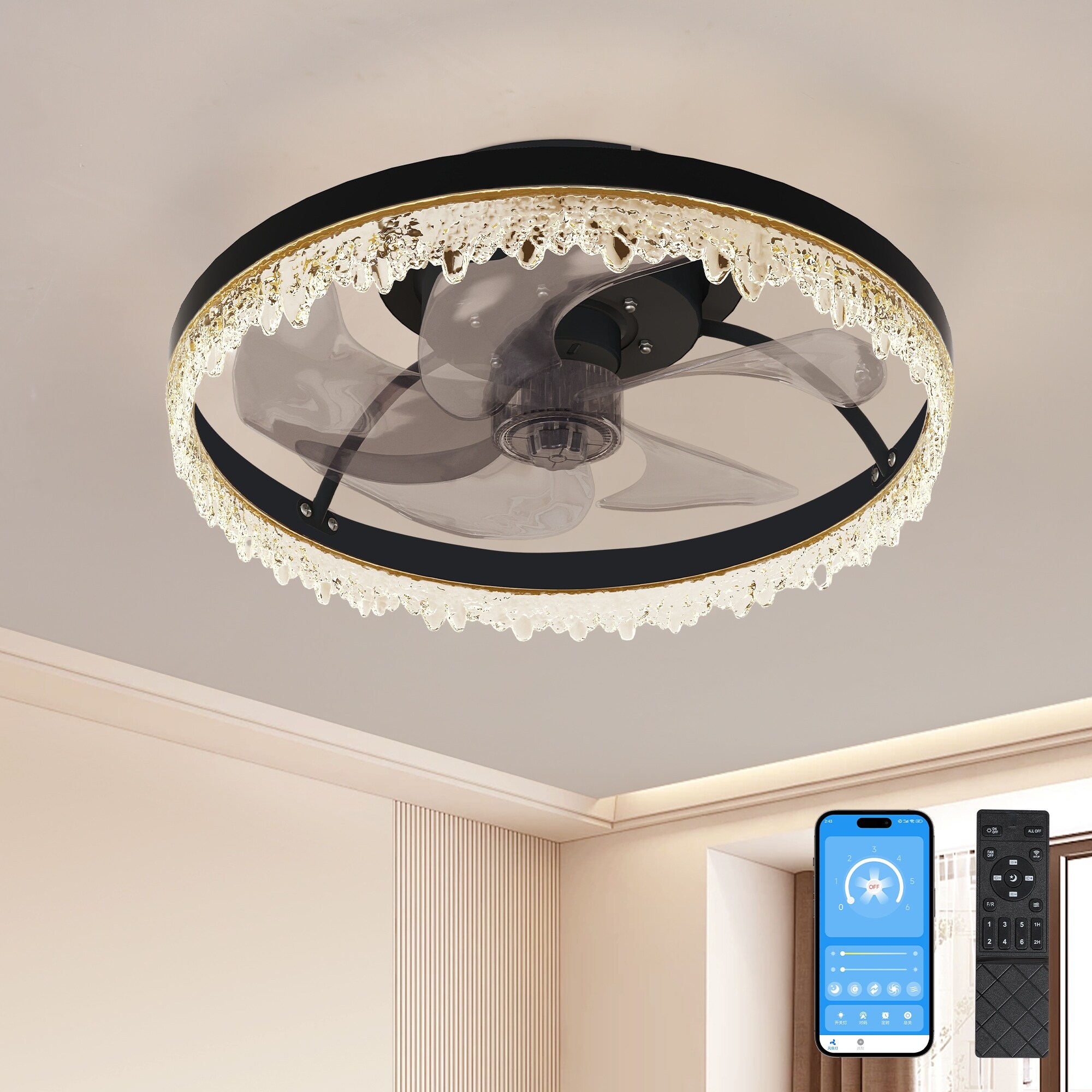 24"/20"/16" Crystal Ceiling Fan with Light, Flush Mount LED Chandelier Fan Round Ceiling Light for Bedroom Living Room