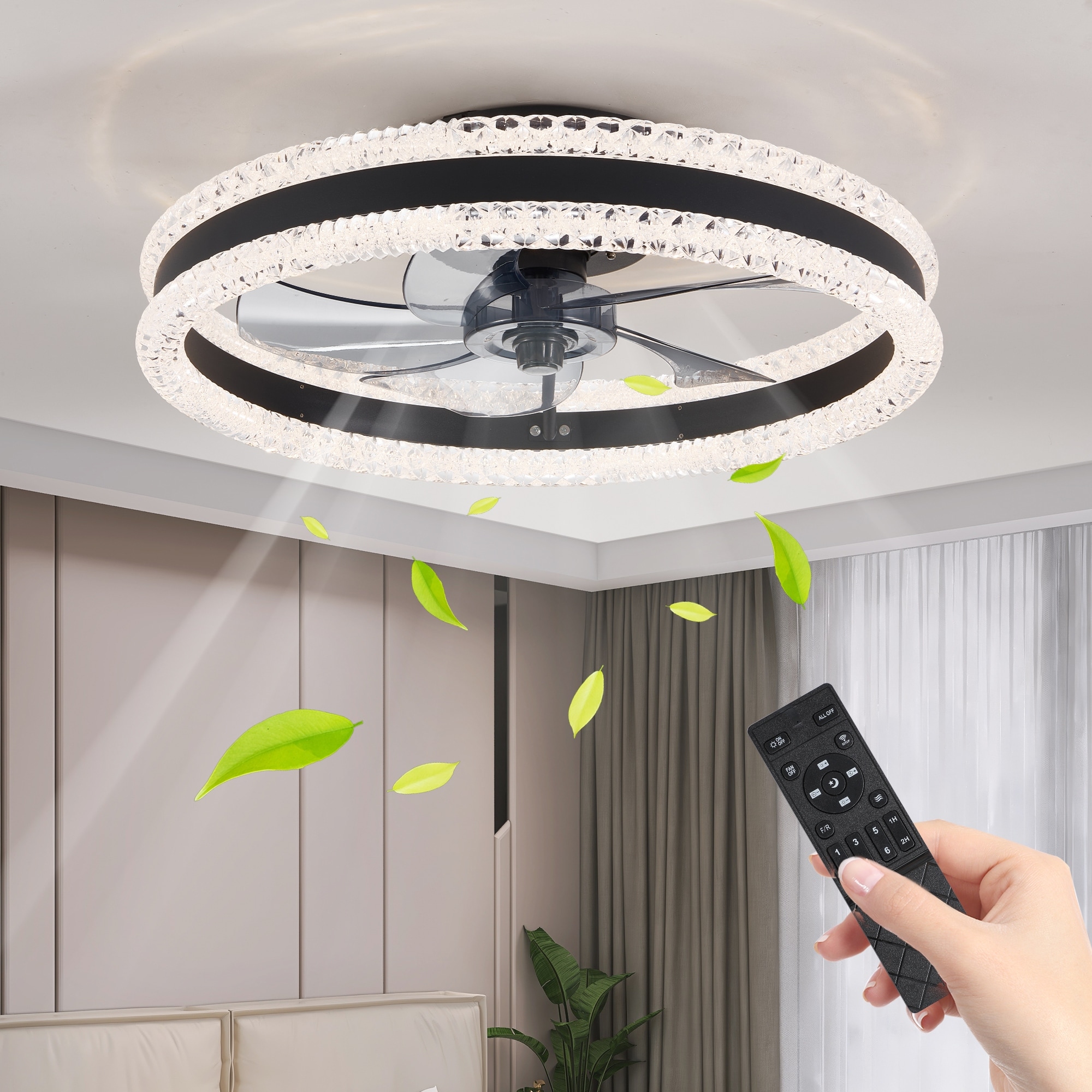 Double Crystal Ring Design LED Ceiling Fan with Light, Modern Flush Mount Ceiling Fan Chandelier, Retractable ABS Fan Blades