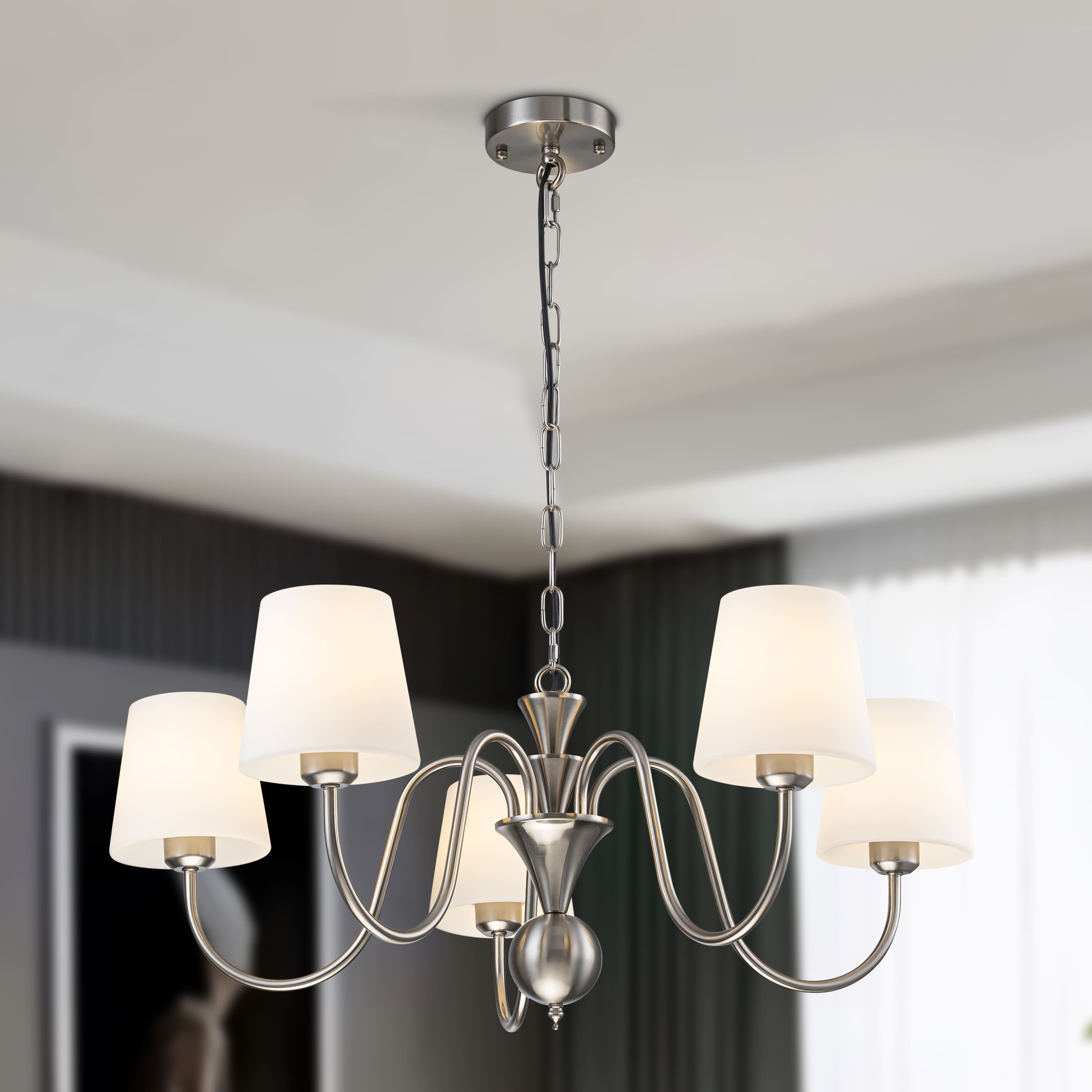 Starsky 5-Light Brushed Nickel with White Glass Shade Chandelier