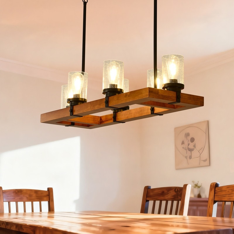 Rustic Rectangular Wood Chandelier with Seeded Glass Shades - 6-Light Farmhouse Pendant for Dining Room Kitchen