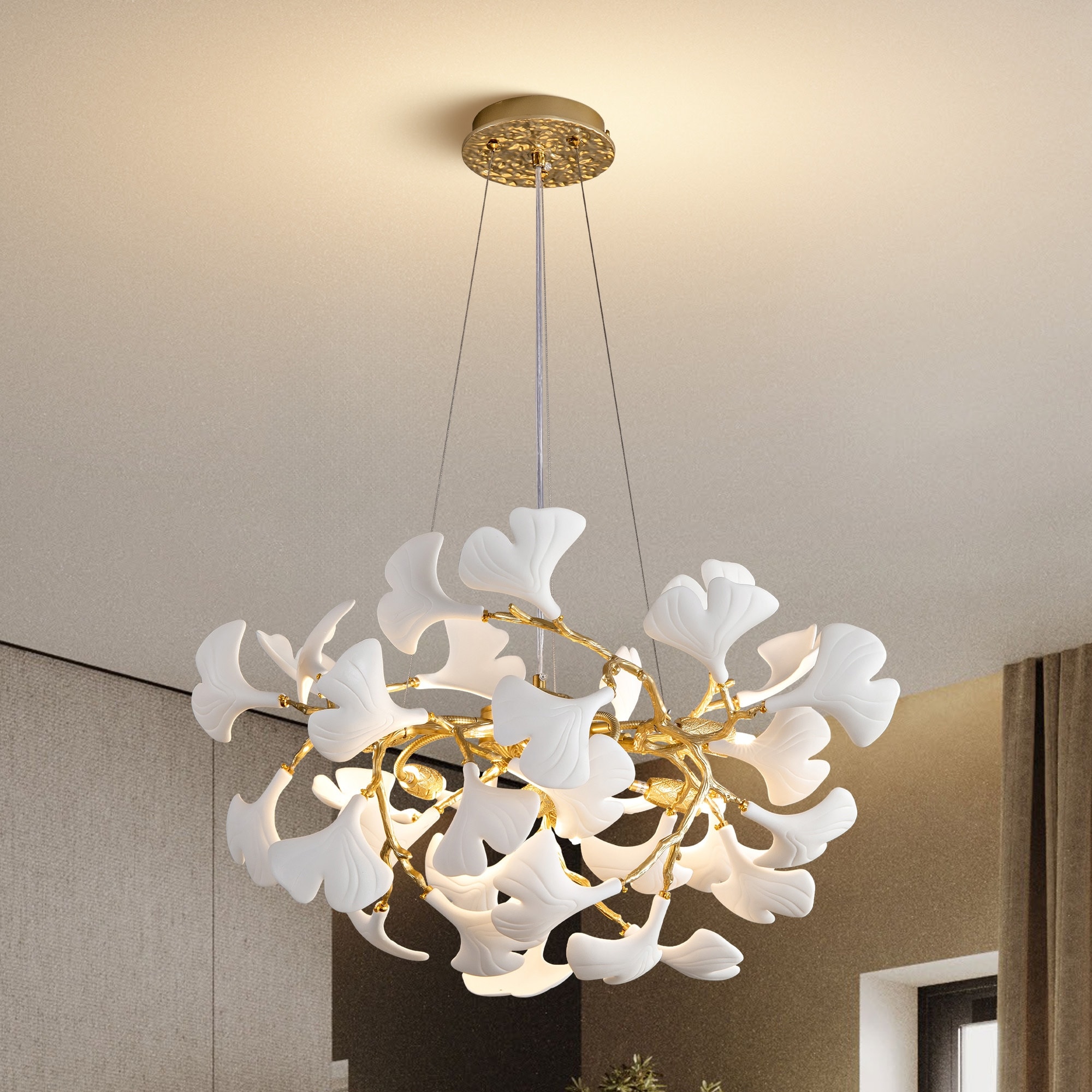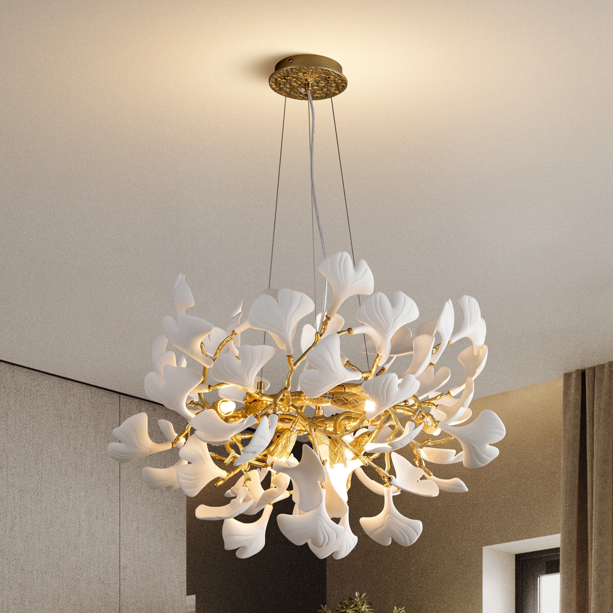 KAYLA Modern Ginkgo Leaf Ceramic Chandelier, Moon Ring Round Pendant Light, D550-D1200, Gold Finish