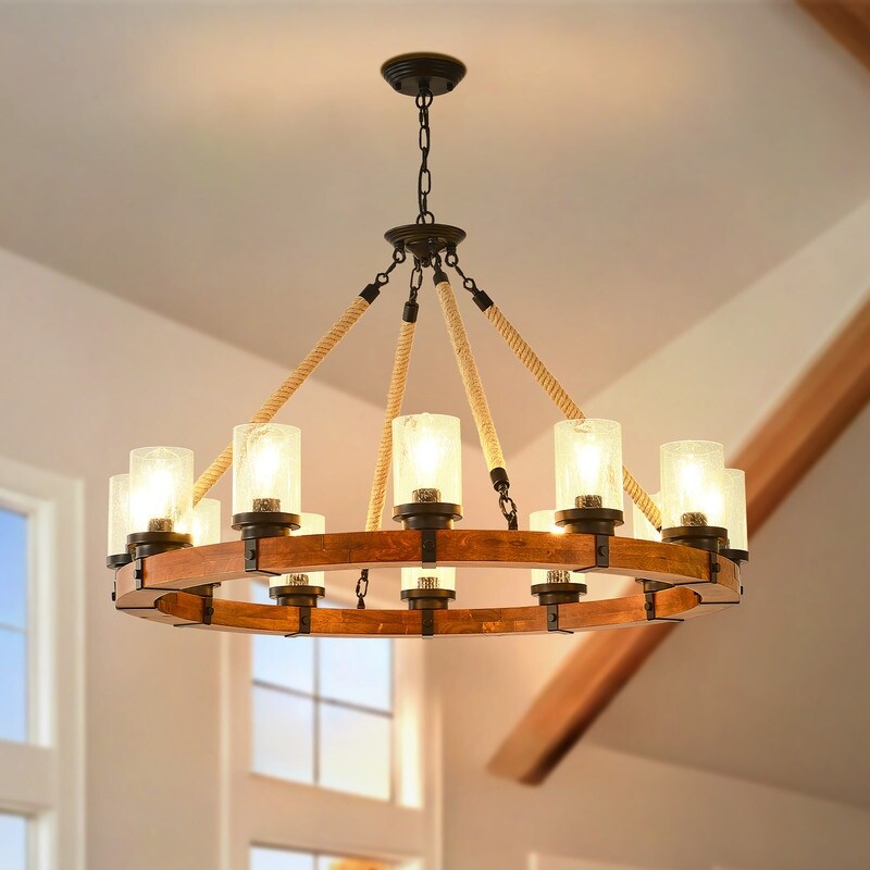 Rustic Wagon Wheel Chandelier Round Wood Farmhouse Chandeliers with Seeded Glass Shade