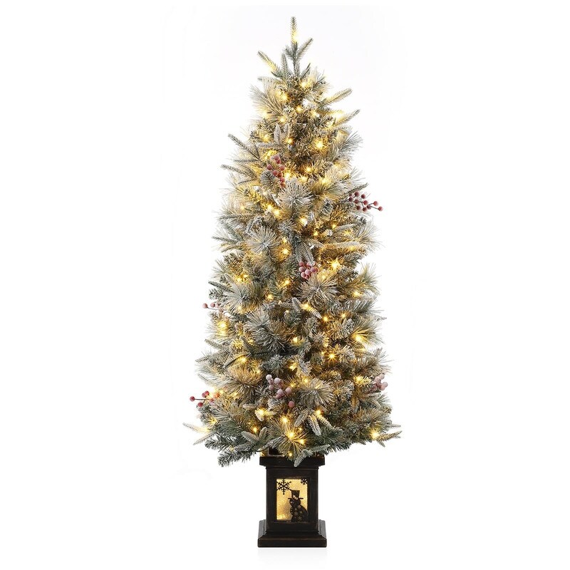 Prelit Christmas Trees with 200 Warm Lights and 20 Clusters Red Berry, Artificial Potted Xmas Tree with 8 Light-Modes
