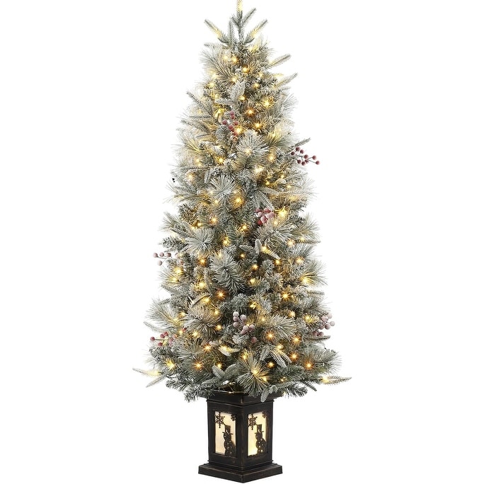 4.5ft Snow Flocked Artificial Christmas Tree with Faux Berries & Snowman Base, Festive Entryway or Office Décor