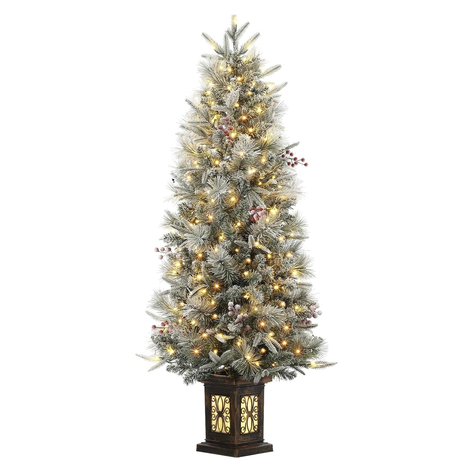 4.5 Ft Artificial Christmas Tree with 200 Warm White LED Lights and Red Berries Potted Base Holiday Xmas Tree